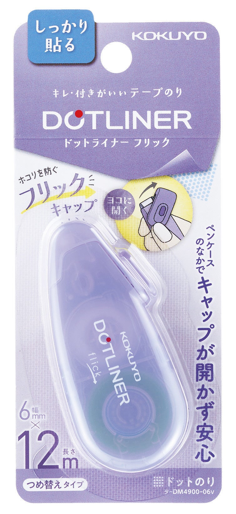 コクヨ株式会社(本社:大阪市/社長:黒田 英邦)は、業界最小クラスながらテープ長さ12mのつめ替えタイプで、ペンケースの中でキャップが勝手に開きにくいのに、使うときは片手でサッと開閉できる新機構の“フリックキャップ”を搭載した「テープのり<ドットライナーフリック>」を、6月22日(水)から販売します。