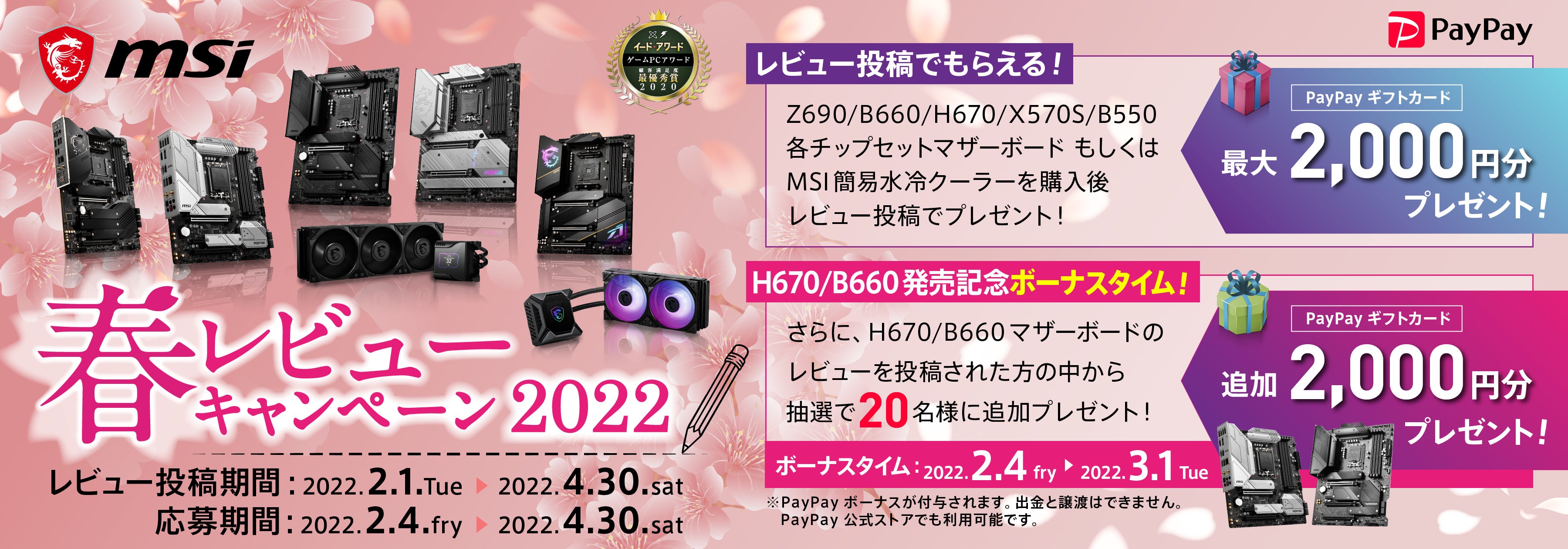 この度、エムエスアイコンピュータージャパン株式会社は、2022年2月1日(金)~4月30日(土)までの間、対象のZ690/H670/B660/X570S/B550チップセットを搭載したマザーボードやMSI簡易水冷クーラーを購入後、価格.comなどの指定サイトにレビューを投稿いただいた方全員に最大2,000円分のPayPayギフトカードをプレゼントする「春 レビューキャンペーン2022」を開催いたします。さらに、2022年より新たに発売されたH670/B660チップセット搭載マザーボードの登場を記念して、該当製品を購入しレビューを投稿いただいた方の中から抽選で20名様に、追加で2,000円分のPayPayギフトカードをプレゼントするボーナスチャンスもご用意いたします。