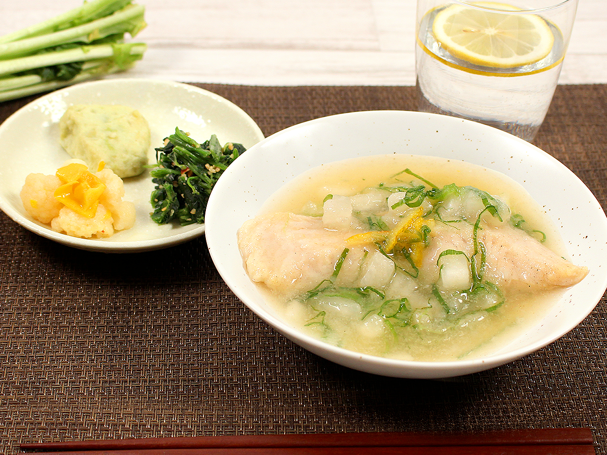 白身魚はやわらかく蒸し上げられ、口の中でほどけるような食感になっています。お出汁香る醤油ベースのたれと、ゆずの爽やかな香りで冬らしく仕上げています。
