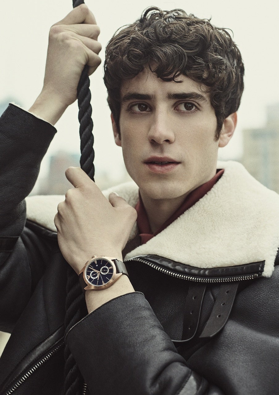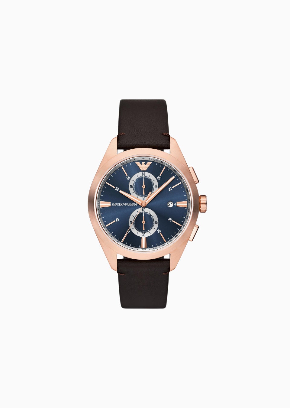 高級感と暖かみを醸し出すローズゴールドのケースに、ブラウンレザーストラップを組み合わせたインパクトのあるクロノグラフウォッチ。フェイスはサンレイ仕上げの深いネイビーブルーが美しい。クロノグラフと3時6時9時にバーティカルに配置されたバーインデックスが華やかさを添えます。