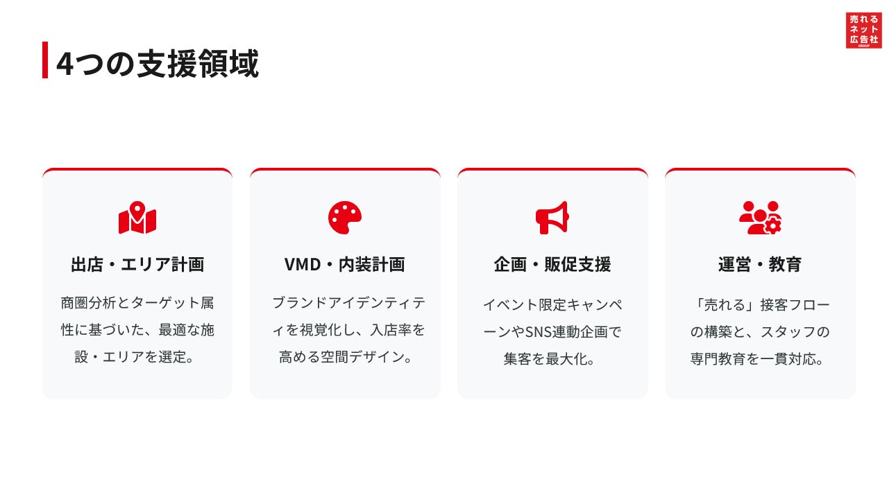 加えて、「売れる」接客フローの構築およびスタッフ教育、現場オペレーションの整備までを一貫して支援し、現場における販売力の最大化を図ります。