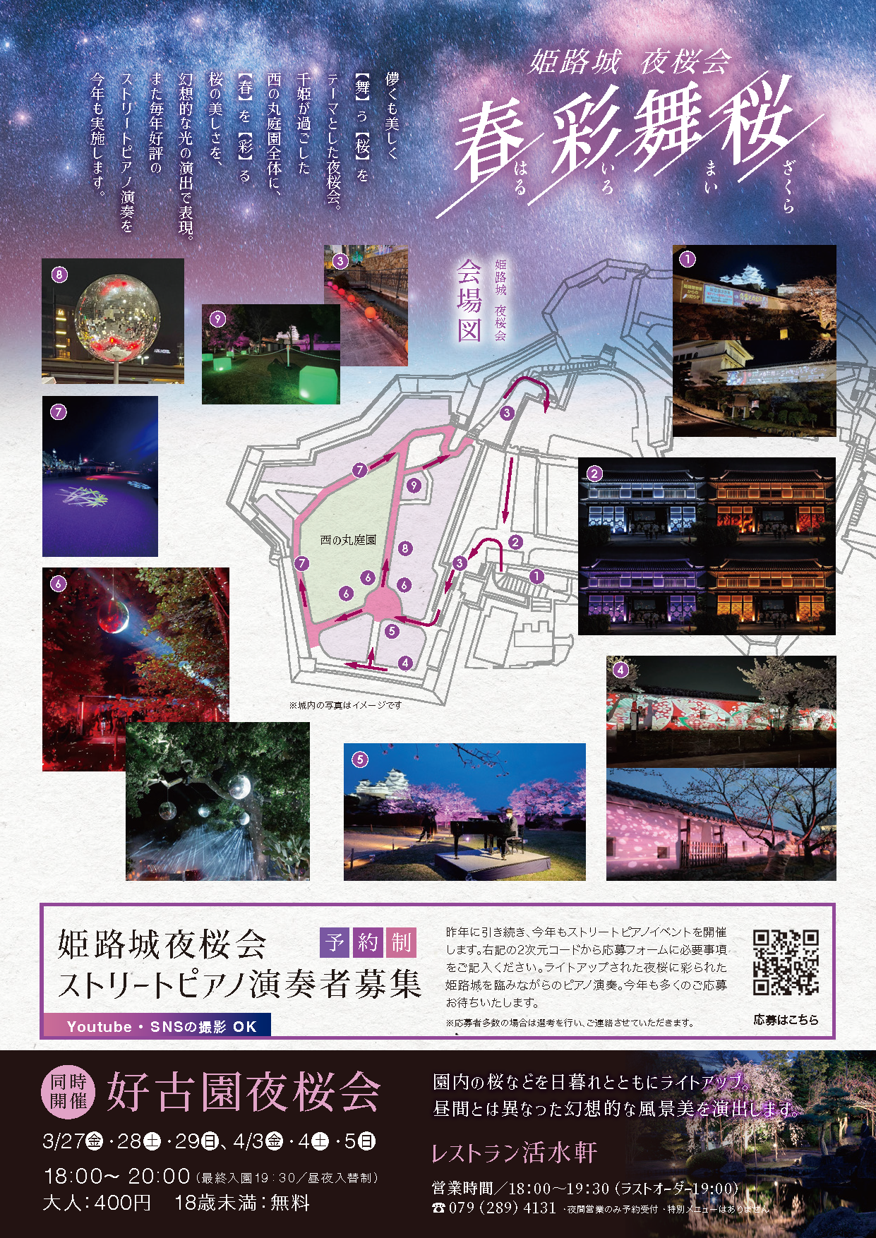 千姫が過ごした西の丸庭園全体に、【春】を【彩】る桜の美しさを、幻想的な光の演出で表現。また毎年好評のストリートピアノ演奏を今年も実施します。