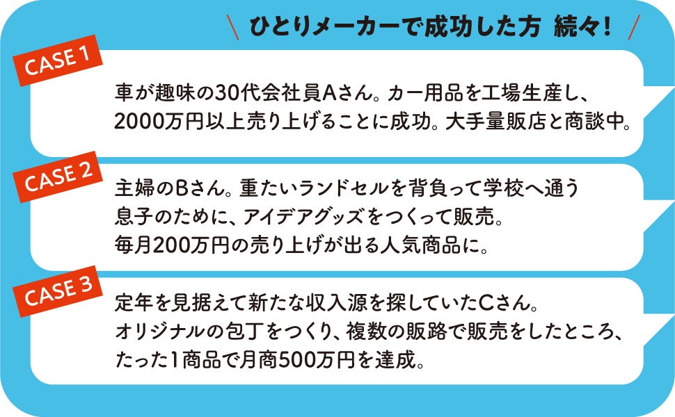 世の中にある仕組みを最大限活用すれば、「ひとりメーカー」を簡単に始められます! 働き盛りの会社員、主婦の方、定年を見据えて新たな収入源を探している方など、ごく普通の方々が「ひとりメーカー」を実践し、成功を収めています。