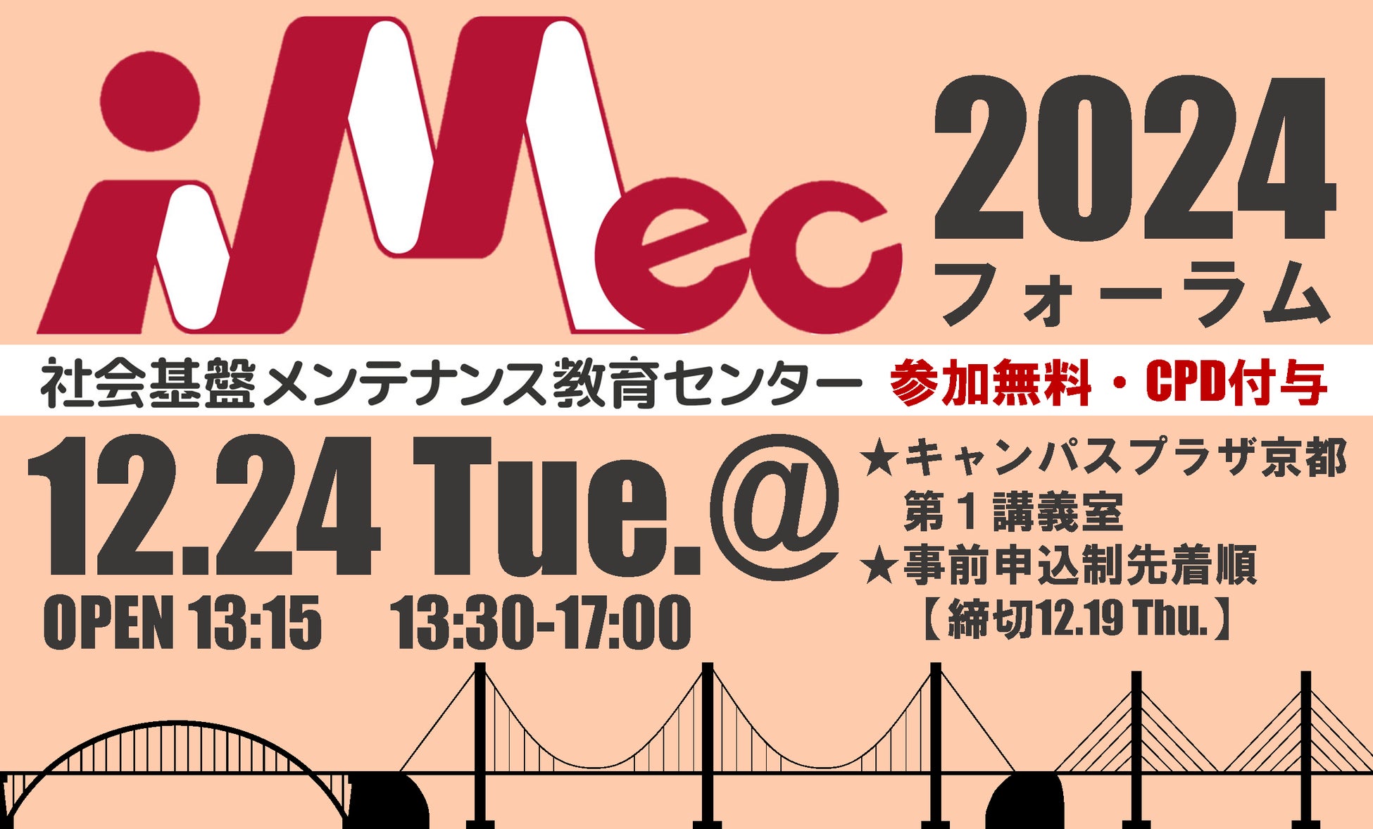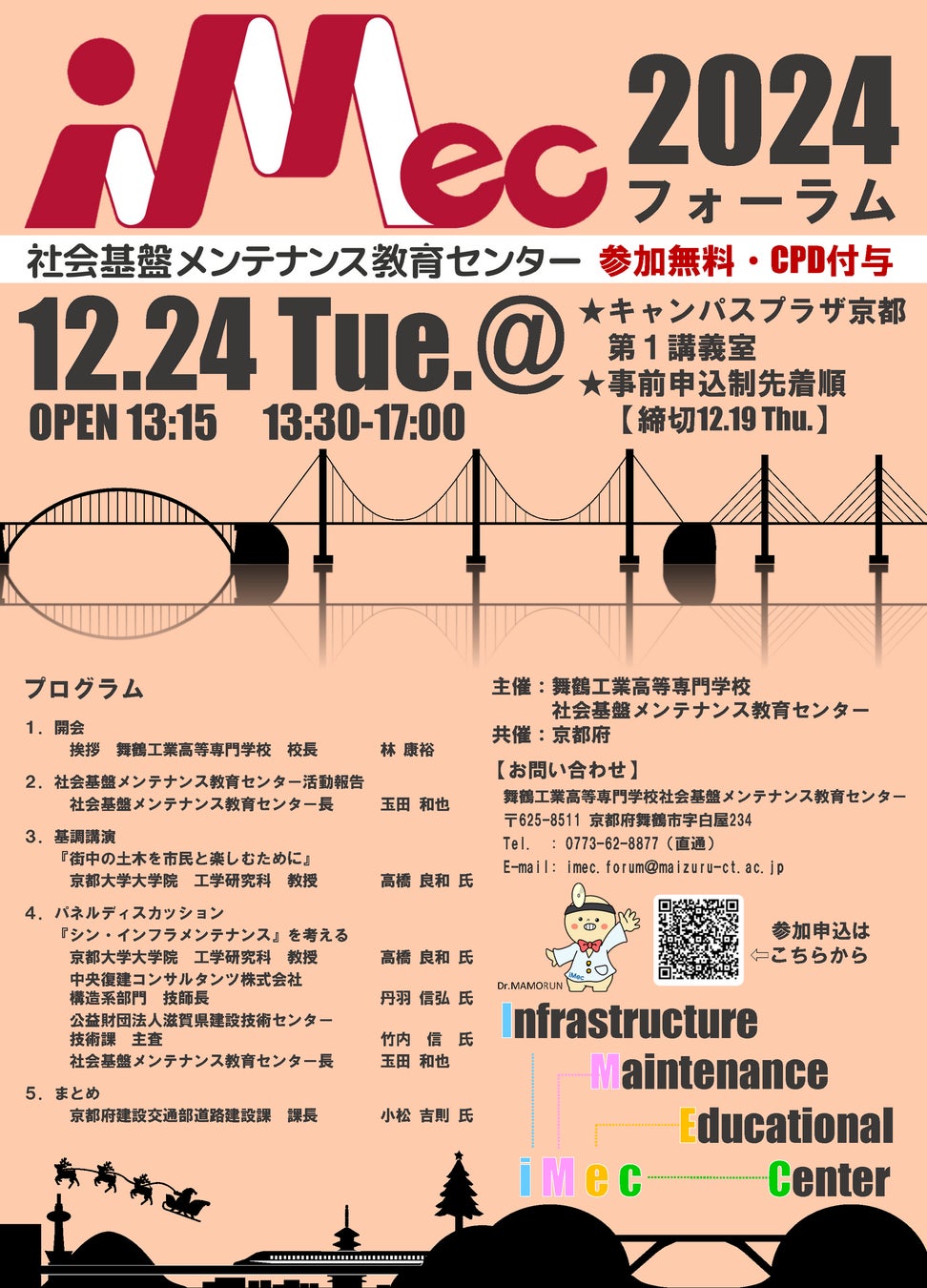 舞鶴工業高等専門学校(京都府舞鶴市 校長:林 康裕 以下「舞鶴高専」) 社会基盤メンテナンス教育センター(iMec)は、産官学が集い、インフラメンテナンスについて学びあう「iMecフォーラム2024」を12月24日(火)に開催致します。今年度は、京都大学大学院 工学研究科 教授の高橋 良和(たかはし よしかず)氏をお迎えし、『街中の土木を市民と楽しむために』と題してご講演いただきます。パネルディスカッション『シン・インフラメンテナンス』を考える。では、インフラメンテナンスの未来、未来にも必要とされる基礎的な素養についてディスカッションします。