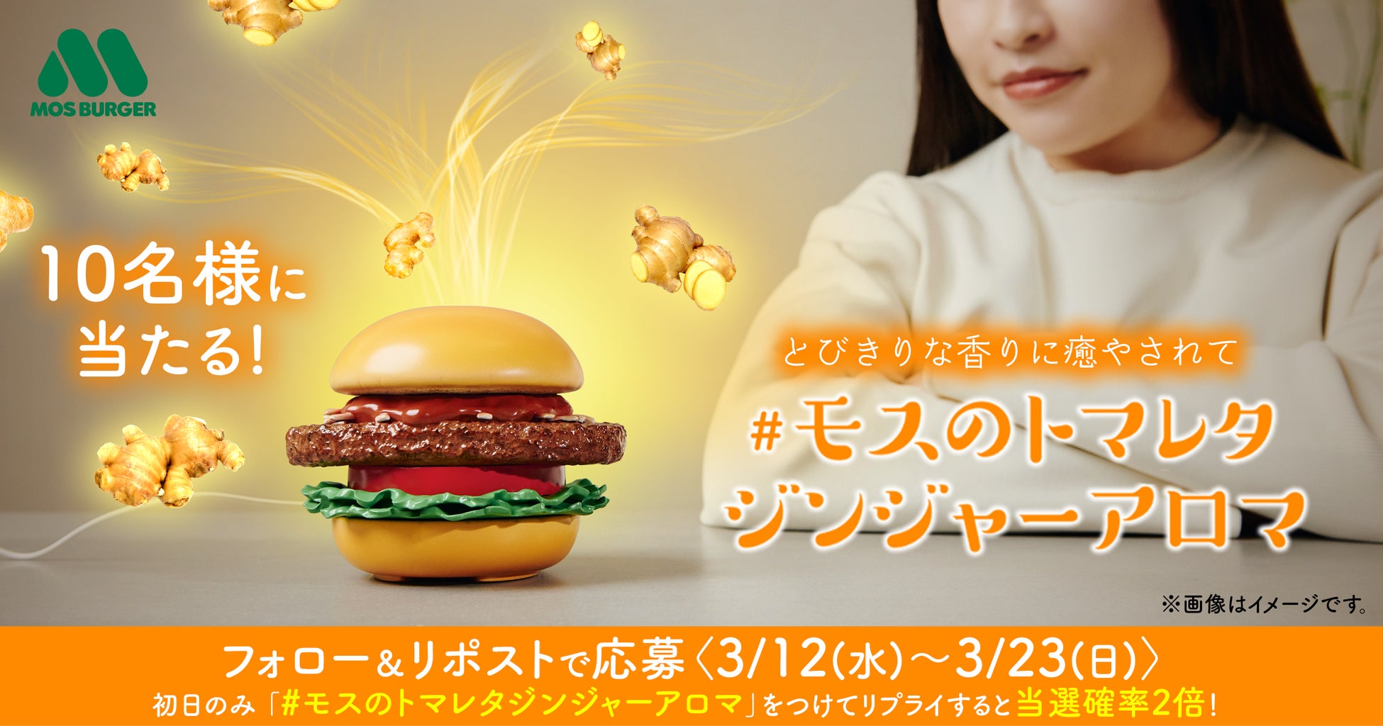 ※初日のみキャンペーン投稿に「#モスのトマレタジンジャーアロマ」を付けてリプライすると当選確率が2倍になります。