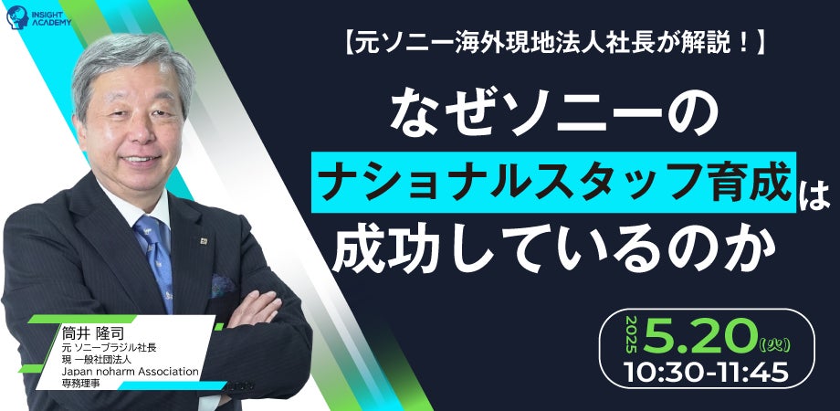 グローバル⼈材育成・研修業を⼿掛けるインサイトアカデミー株式会社(本社:東京都港区新橋、代表:金 珍燮)は、無料webセミナー「【元ソニー海外現地法人社長が解説!】なぜソニーのナショナルスタッフ育成は成功しているのか」を2025年5月20日(火)10:30より開催します。