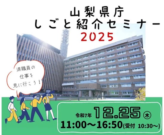 山梨県(知事:長崎 幸太郎)は、学生の冬休みに合わせ、県職員の仕事や魅力、やりがいなどについて理解を深めるとともに、職場の雰囲気を直接体感できるイベント「山梨県庁しごと紹介セミナー2025」を開催します。