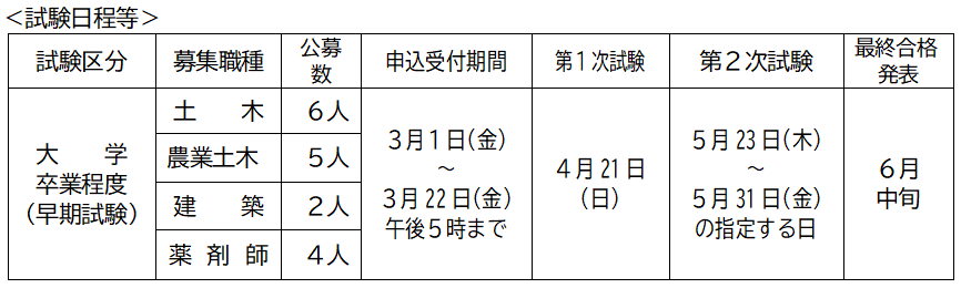試験区分ごとの試験日程、募集職種、採用予定者数は、下記のとおりです。