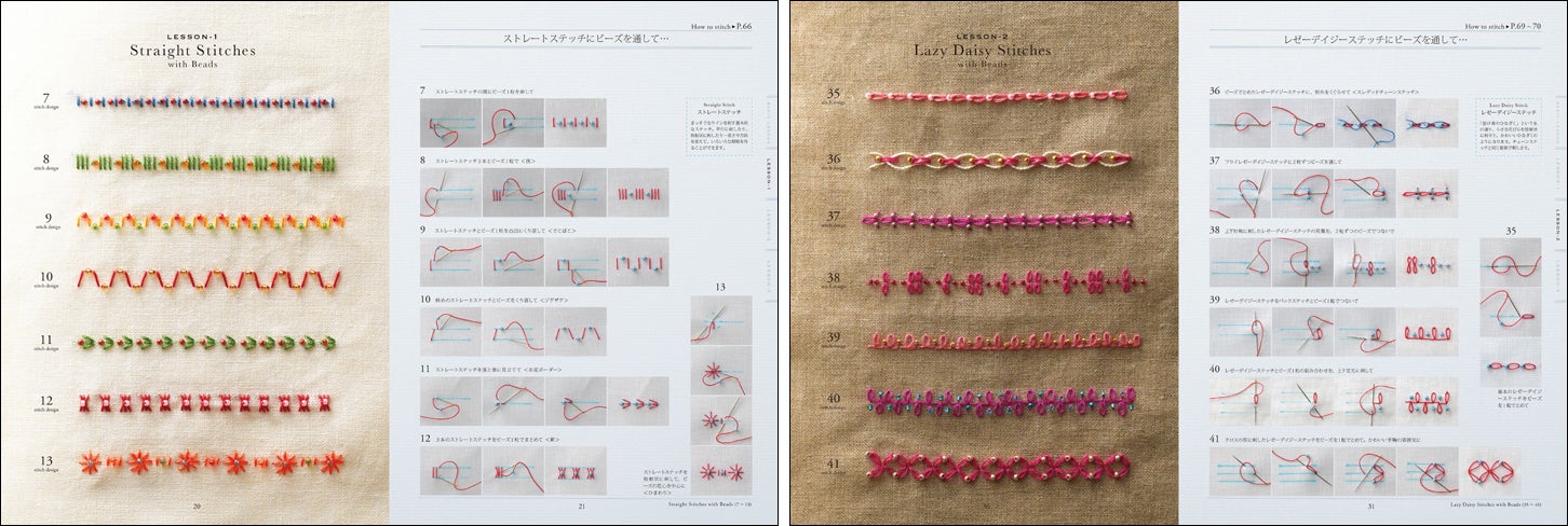 130種の刺繍の基本ステッチで、ビーズを刺す技法を紹介します。
