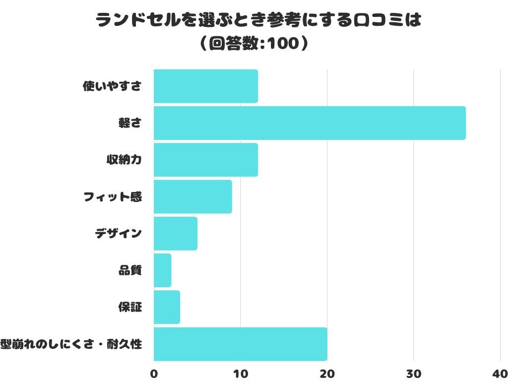 ランドセルのどんな内容の口コミを参考にするかをアンケートにて調査したところ、1位は「軽さ」 でした。