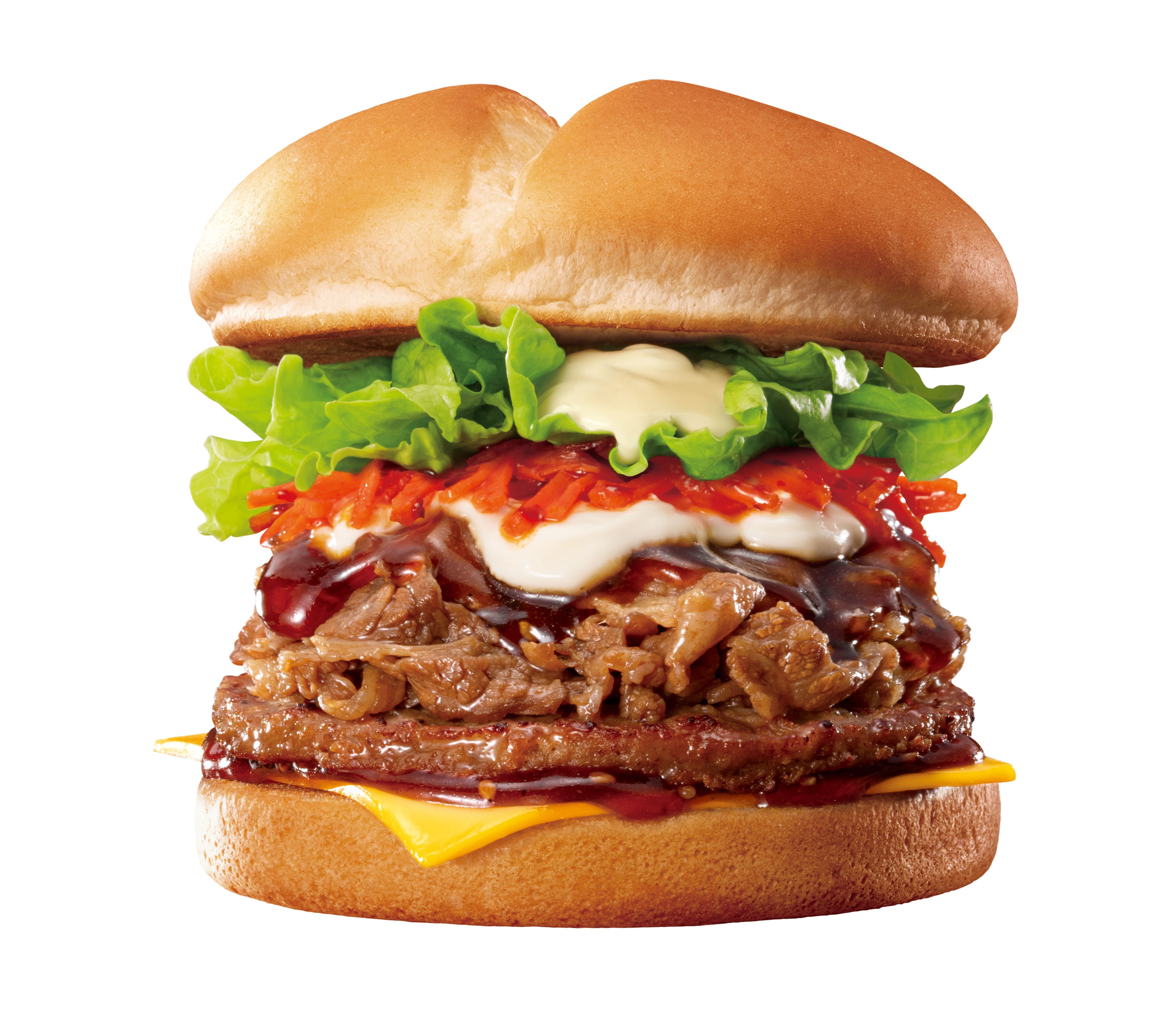 商品概要:ハンバーグパティに、甘めのプルコギソースで味付けした牛カルビ肉をトッピングし、ヤンニョムソース、細切り人参、レタス、マヨネーズとともにふっくらなめらかな食感のバンズで挟みました。甘辛な味わいが食欲をそそるバーガーです。