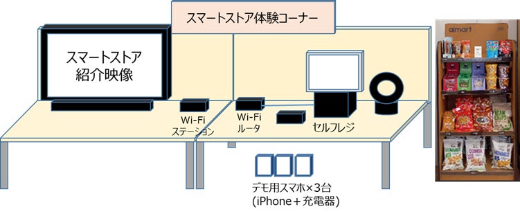 NTT東日本グループで提供するスマートストアは、販売要員およびレジ要員を置かず、入店から商品選択、セルフレジ決済、退店までを利用者ご自身のスマートフォンのみで完結する仕組みとなっております。また、防犯カメラ