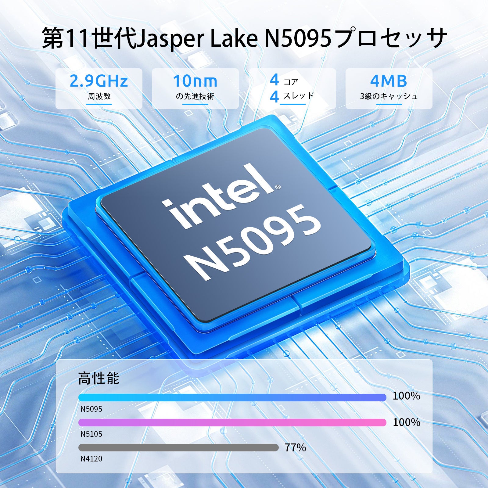 インテル第 11 世代 N5095:B3 は Intel の第 11 世代 Jasper Lake N 5095 プロセッサ(2.0GHz~2.9GHz)を使用します。新しいTremontアーキテクチャーに基づいて、4コア4スレッド、4MB3級のキャッシュ、10nmの先進技術、パルス周波数2.90 GHz、性能が前世代プロセッサーより35%高い、メモリ速度が2933 MHzで、最大メモリ。第11世代のN5095では、より安定した画質が得られます。4K再生も問題なし。PS、ビデオクリップ、YouTubeなどをスムーズに実行できます。