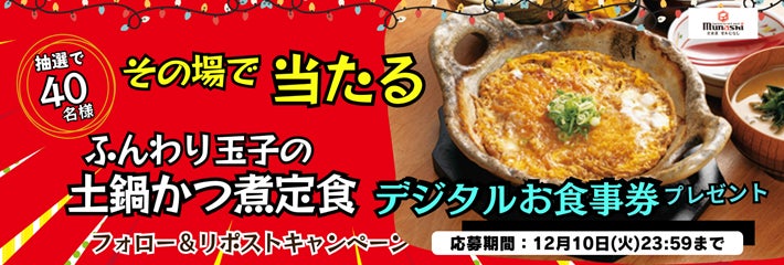 あわせて2024年11月27日(水)午前11時~2024年12月10日(火)の期間に「宮本むなし公式Xフォロー&リポストキャンペーン」を実施いたします。宮本むなしの公式Xアカウントをフォローし、キャンペーン投稿をリポストすることで応募でき、その場での抽選で40名様に、定食屋宮本むなし各店舗内で「ふんわり玉子の土鍋かつ煮定食(950円税込)」1人前をお召し上がりいただけるデジタルお食事券が当たるキャンペーンです。ぜひこの機会に宮本むなし公式Xのフォロー&リポストでのご参加をお待ちしております。
