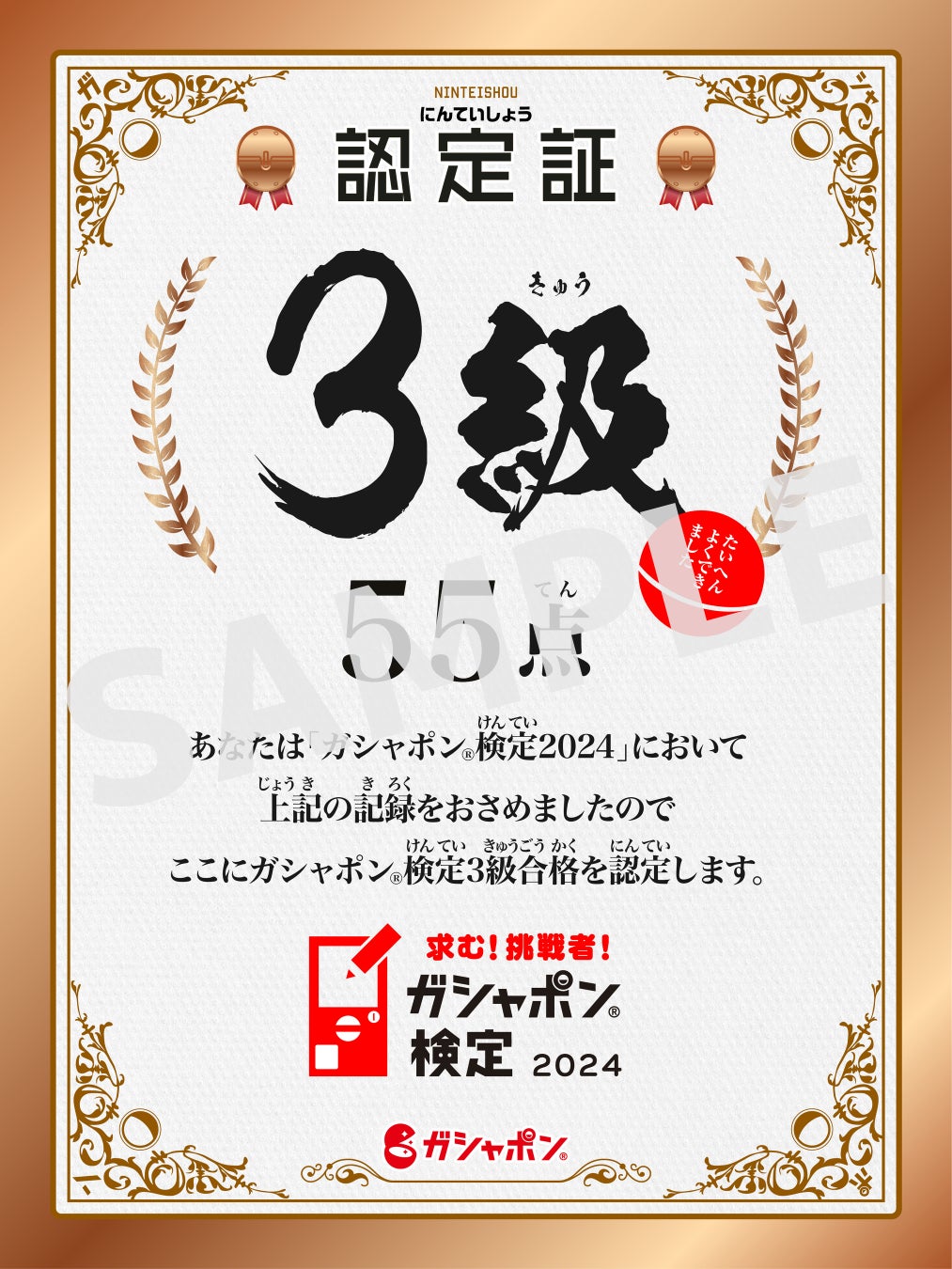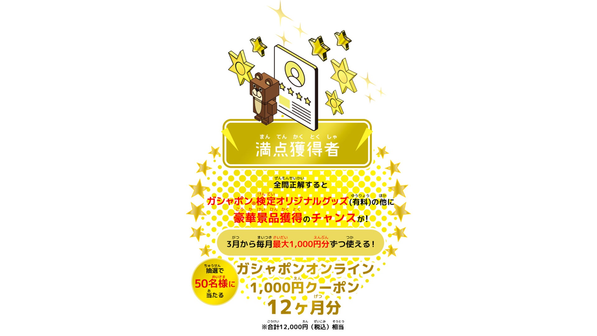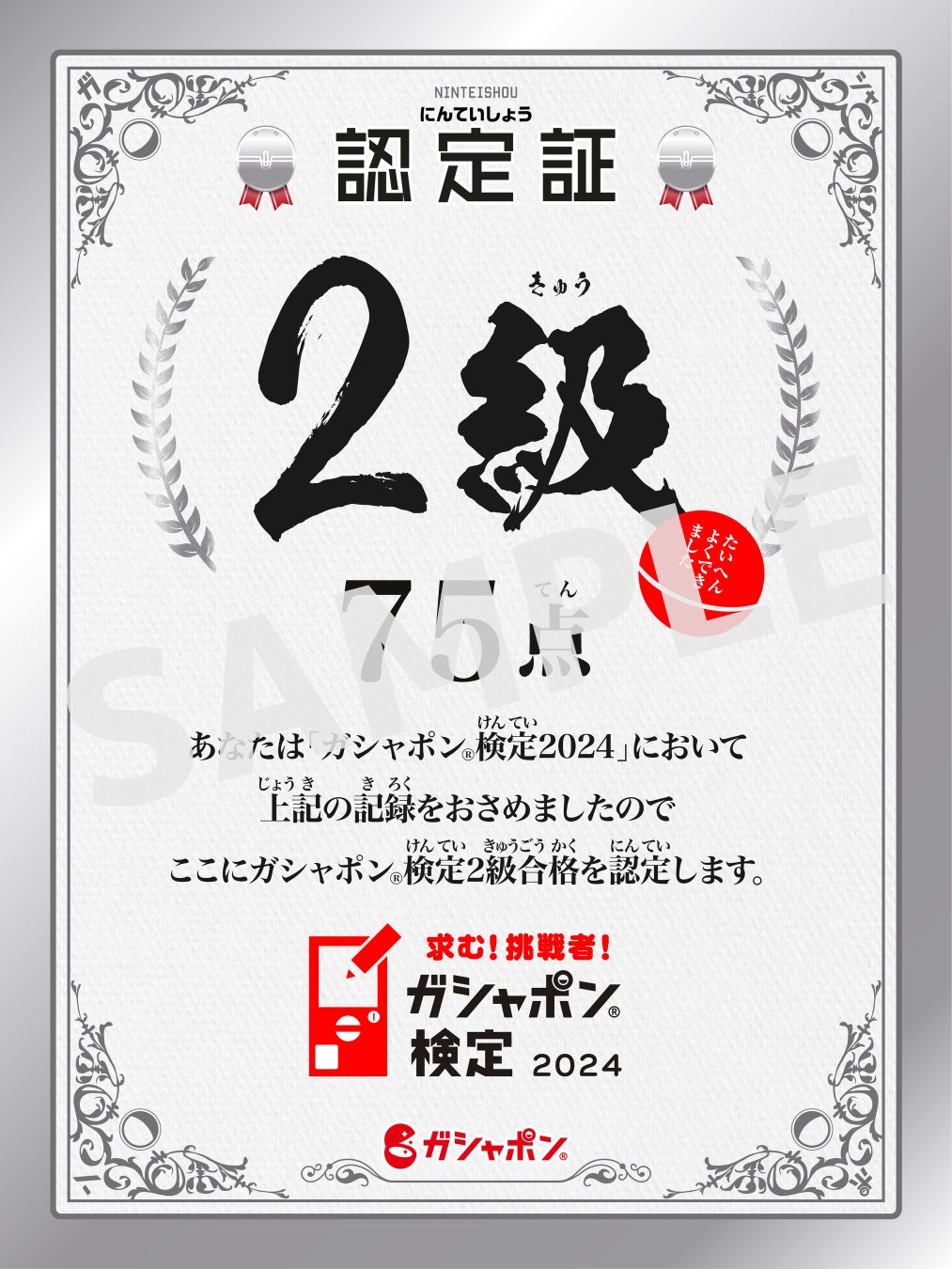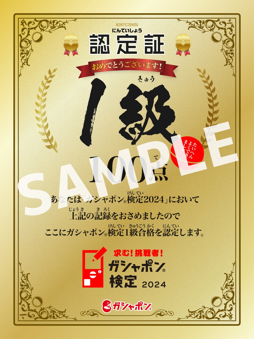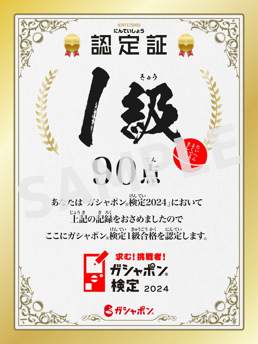 3級以上を獲得すると、点数が表⽰された各級ごとのデジタル合格認定証が贈呈され、無料でダウンロードすることができます。1級に合格すると、ロゴ入りのアクリルキーホルダーと認定証カードがセットになった「求む!挑戦者!ガシャポン®検定2024」オリジナルの1級合格認定グッズ(有料)の購⼊権がゲットできます。さらに、満点を獲得した⽅の中から抽選で50名様に「3⽉から毎⽉最⼤1,000円分ずつ使える!ガシャポンオンライン1,000円クーポン12カ⽉分 ※合計12,000円(税込)相当」の豪華景品をプレゼントします。
