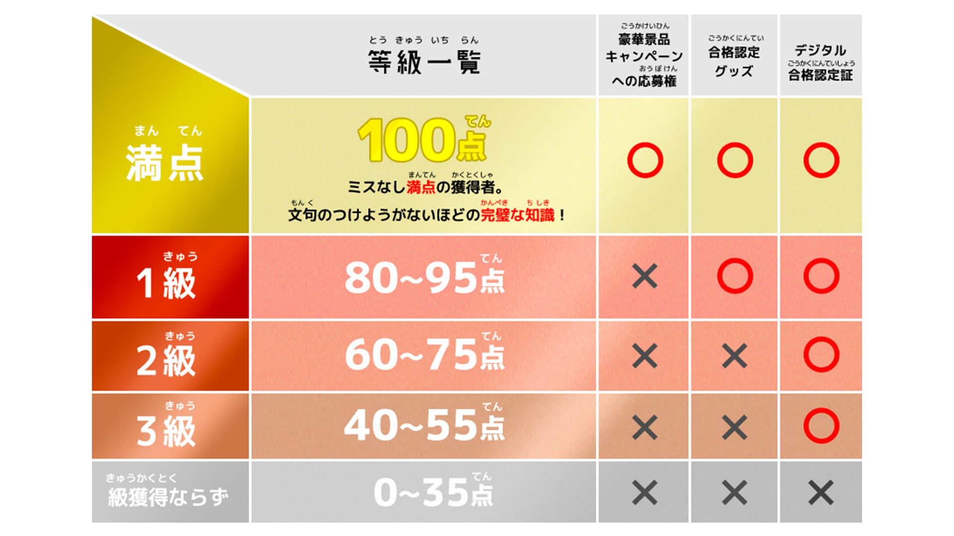 問題は「ガシャポン®」の47年の歴史・自販機・商品などについて出題され、4択から回答します。昨年の実施内容から、並び替え問題などの新たな形式を取り入れています。全50問のうち、ランダムで20問が出題されます。解答結果は、「1問5点」の計算で以下の形で級分けされます。