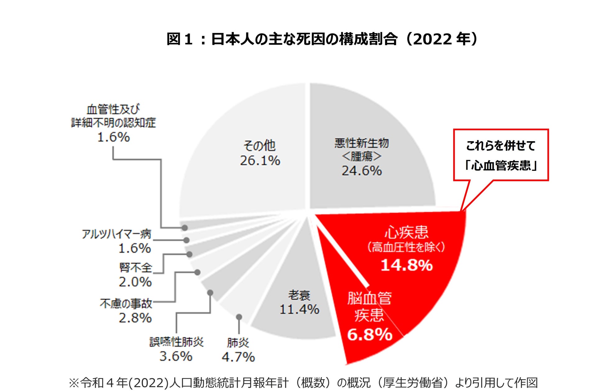 血管は加齢や生活習慣によって柔軟性が低下して硬くなります。そして、そのことが様々な疾患、特に心血管疾患の原因になるといわれています。心血管疾患とは心臓・血管など循環器における疾患の総称のことで、代表的なものに脳卒中や心筋梗塞、狭心症、不整脈などが挙げられます。世界で2019年に心血管疾患によって死亡した人は推定1,790万人とされ、全世界の死亡者数の32%に相当するといわれており※2、主要な死亡原因の1つとなっています。日本でも心血管疾患は死因の第2位となっており、私たちが抱える課題の1つとして捉えられています(図1)。