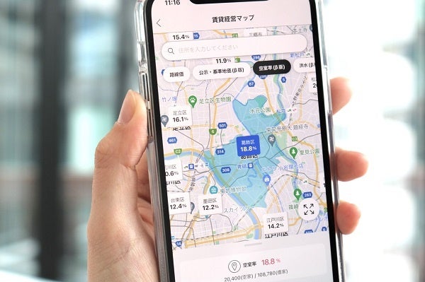 ・「洪水ハザードマップ」や「公示地価・基準地価」、「路線価」などが地図上で確認できる「賃貸経営マップ」に、「エリア別の空室率」が分かる機能が搭載された(現在はアプリ限定で利用可能)