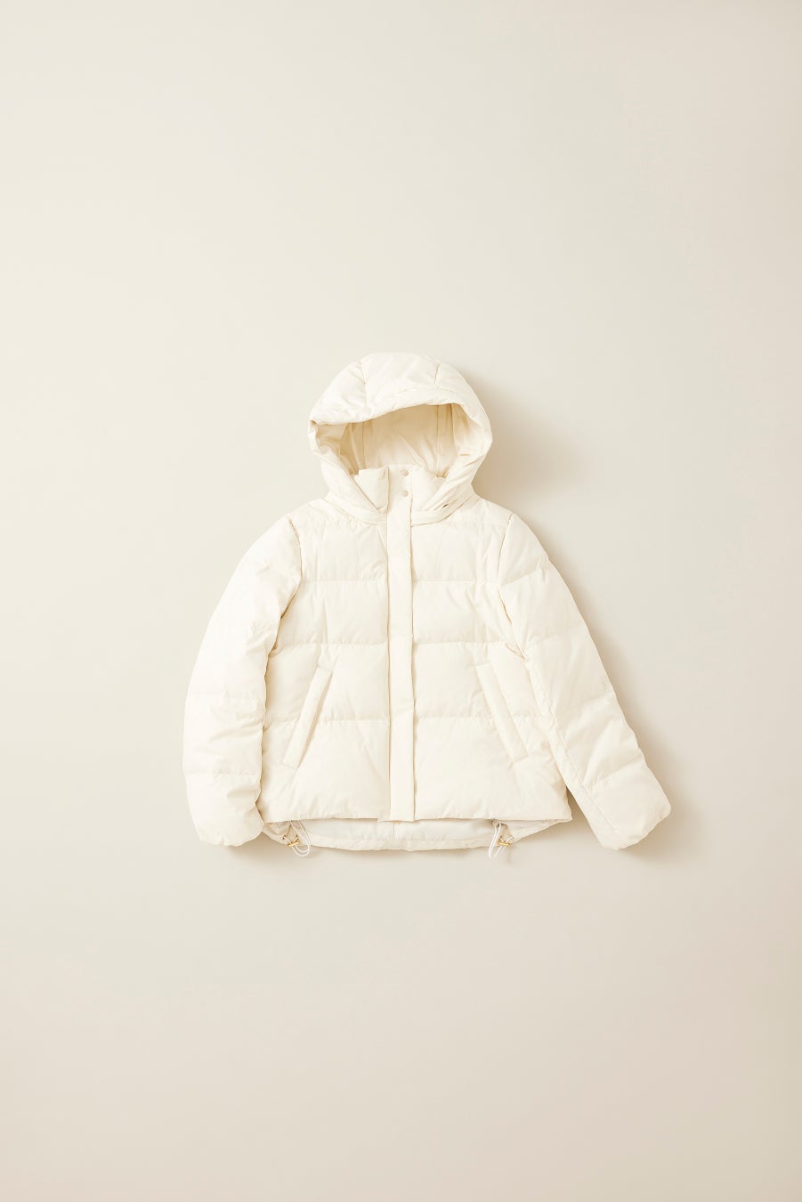 サイズ感と中わたの分量にこだわり軽やかに羽織れるキルティングダウンコートに仕上げました。きらりと光るボタンやキルト幅の大きさがデザインのポイント。フードは取り外し可能で、気分やシーンに合わせた着こなしが楽しめます。ウエスト内側にはドロストコードを備え、シルエットの調整も自在です。