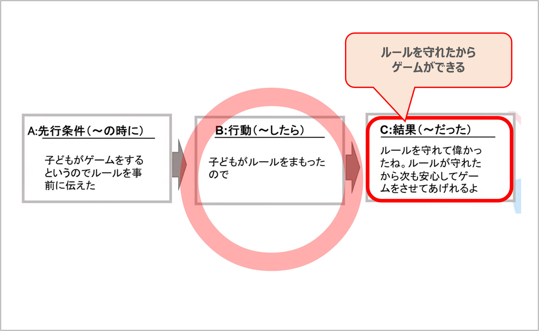 行動分析学の『ABC分析』に基づき『ルールを守ればゲームができる』ことを強化することで、ゲーム時間を減らす効果が期待できます。ABC分析とは、A先行条件(~の時に)、B行動(~したら)、C結果(~だった)の枠組みで考えるものです。