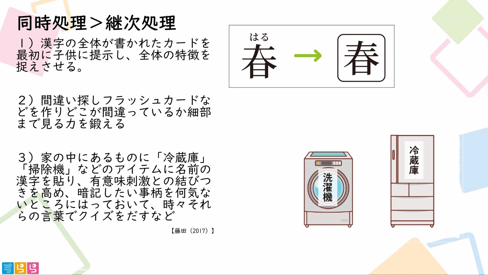 「同時処理」は全体を踏まえて考えることが得意で、目から見た情報で理解が深められる傾向があるため、漢字の正解が書かれたカードを見せた後、間違えがある漢字を見せて、どこが間違っているかクイズ形式で出題する方法で勉強をすると覚えやすくなります。