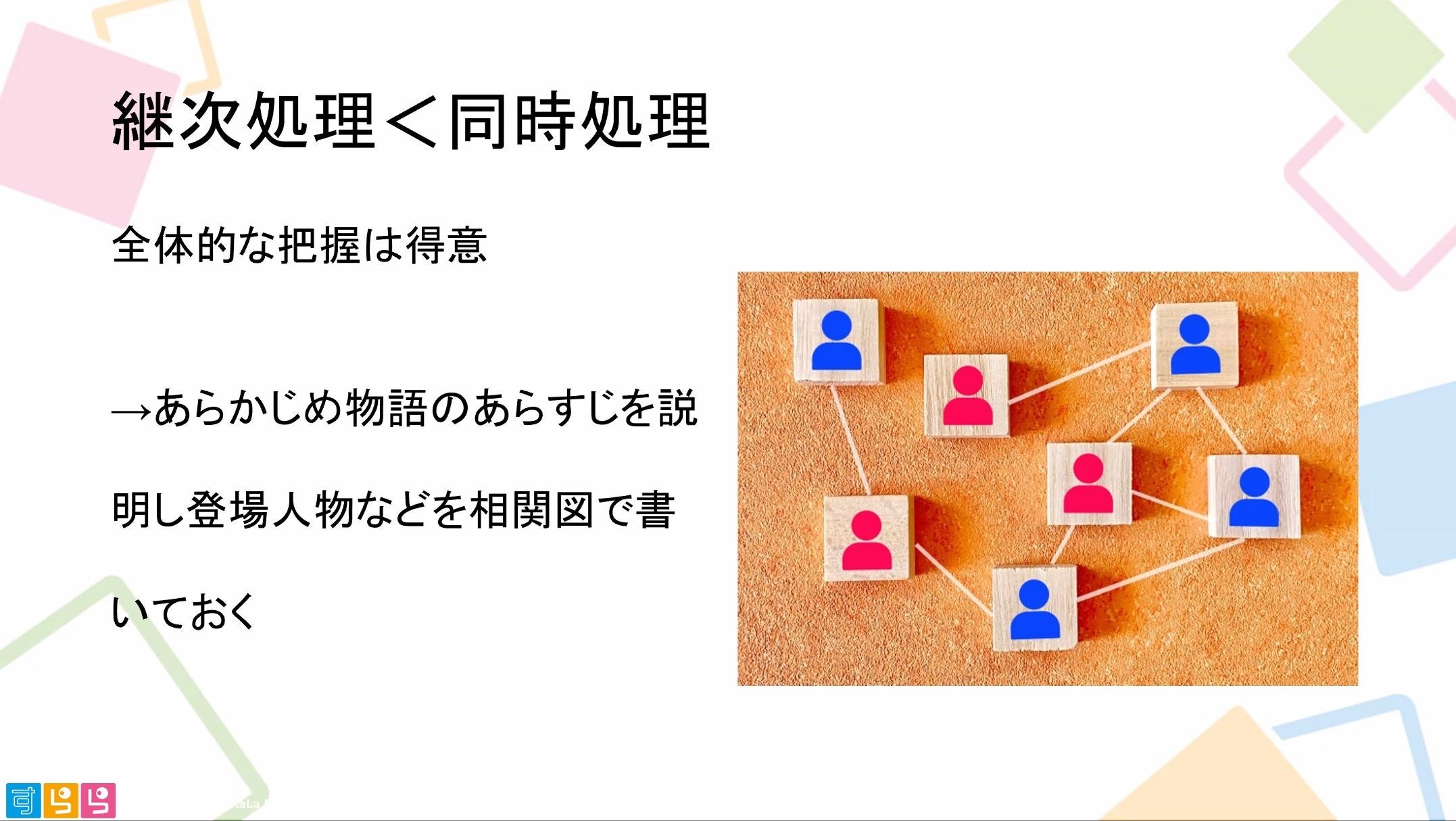 「同時処理」は全体的な把握が得意なので、あらかじめ物語のあらすじを説明し、登場人物などを相関図で書くとよいでしょう。