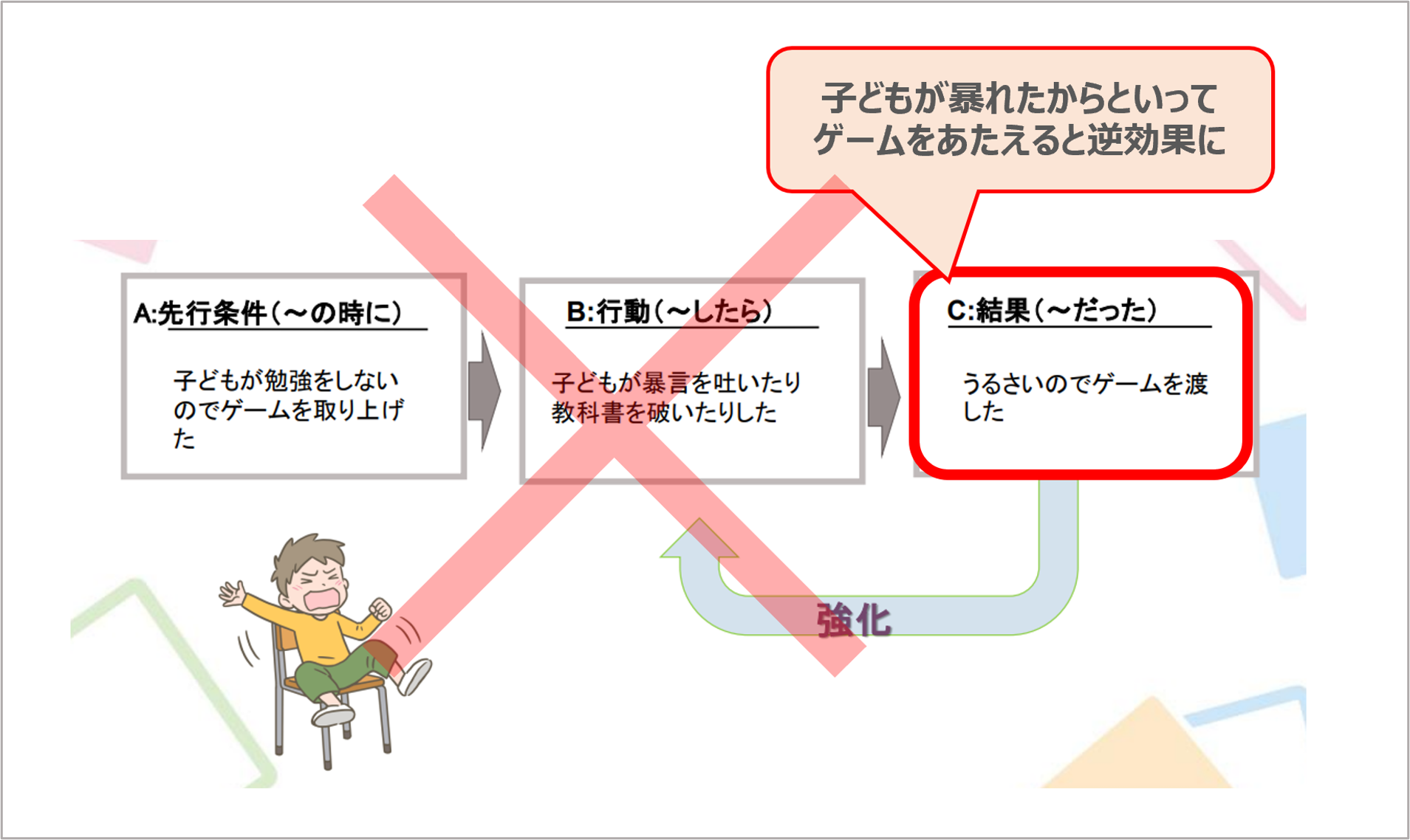 下図を例にすると、子どもが勉強をしないのでゲームを取り上げた(A:先行条件)、子どもが暴言を吐いたり、教科書を破いたりした(B:行動)、うるさいのでゲームを渡した(C:結果)とします。このとき、子どもは「暴れればゲームをさせてもらえる」という経験をします。暴れればゲームができると期待を持つことから、B「行動」をもっとしよう(強化)とする心理が働きます。このような状況にならないためには、最初からルールを徹底して制限し、それができたら必ず褒めてあげることで、「ルールを守ればゲームをできる」ことが強化されます。