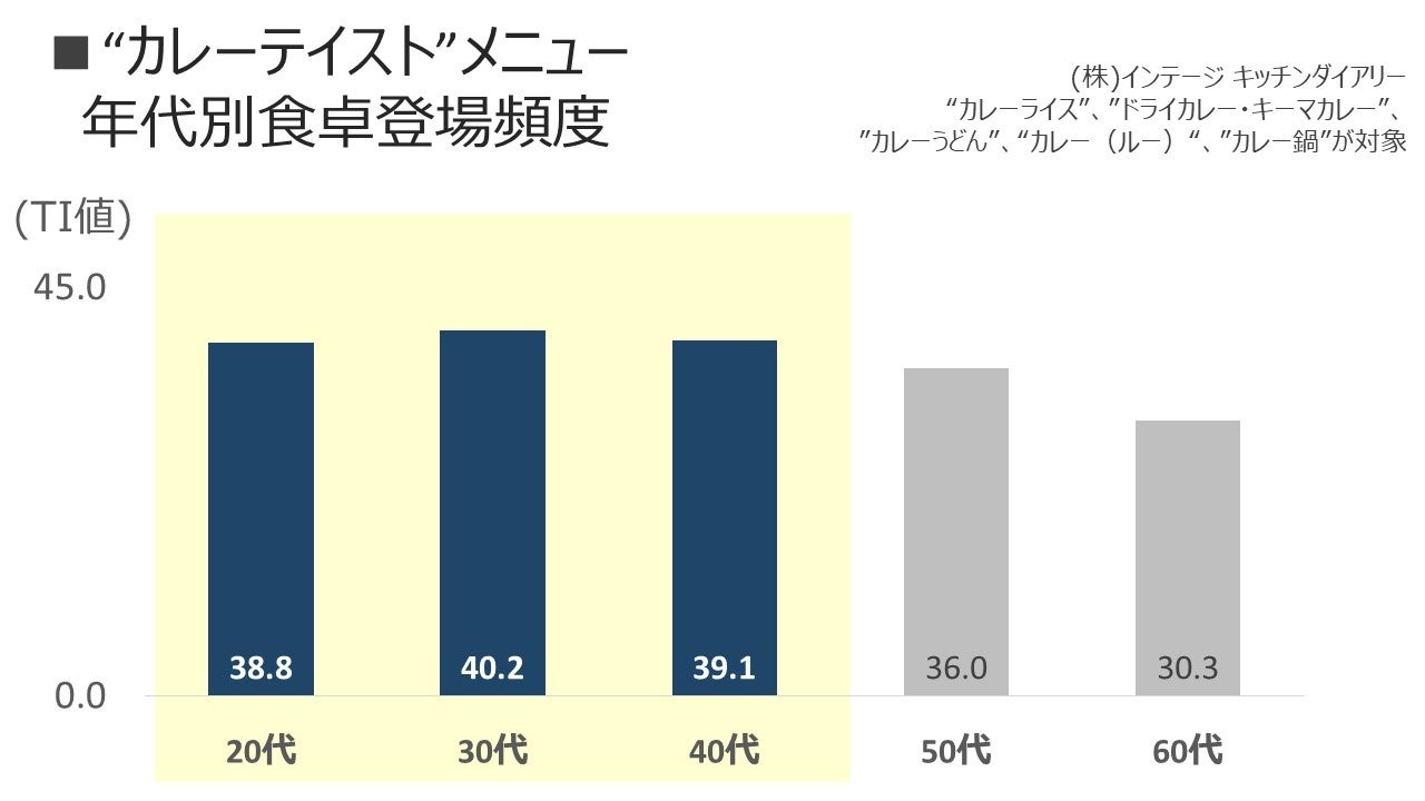 「カレーテイスト」に着目した理由としては、2点あります。1つは自分では作れないテイストである点ともう1つはカレーとシーフードとの結びつきが強いという点です(クックパッド(株)たべみる 23年)。また、カレーテイストのメニューは幅広い年代で人気があり、特に20~40代の若年層の頻度がより高い傾向にあります。((株)インテージ キッチンダイアリー 23年度9-2月※対象メニュー:「カレーライス」、「ドライカレー・キーマカレー」、「カレーうどん」、「カレー(ルー)」、「カレー鍋」)。