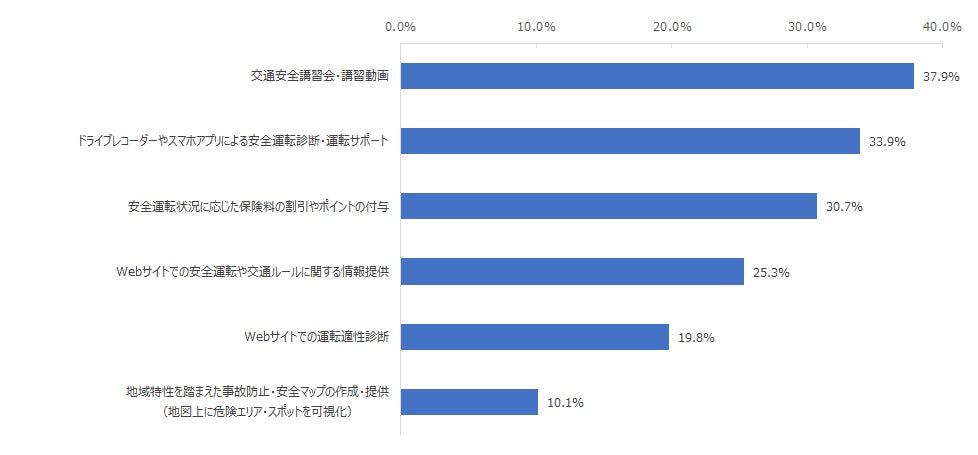 利用したことがある安全運転支援サービスの内容をみると、最も高いのは「交通安全講習会・講習動画」(37.9%)となりました。次いで「ドライブレコーダーやスマホアプリによる安全運転診断・運転サポート」(33.9%)、「安全運転状況に応じた保険料の割引やポイントの付与」(30.7%)といった、運転行動連動型(PHYD:Pay How You Driveの略)のテレマティクス保険サービスが続きました。