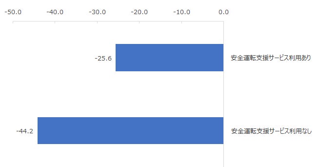 安全運転支援サービスの利用経験の有無別にNPSを分析したところ、利用経験がある人は、ない人に比べてNPSが高い傾向がみられました。安全運転サポートや、運転状況に応じた保険料の割引といった、安全運転を支援し交通事故を削減する取り組みの重要性が示唆されました。