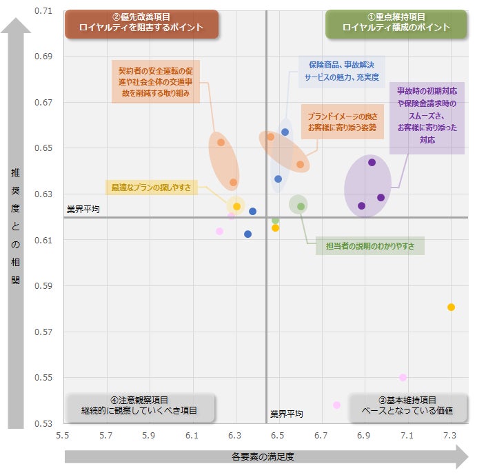 代理店型自動車保険業界全体では、ブランドイメージの良さやお客様に寄り添う姿勢に加え、保険商品の魅力・充実度や事故解決サービスの充実度といった商品性に関する項目がロイヤルティを醸成する要因となりました。一方で、契約者の安全運転の促進や社会全体の交通事故を削減する取り組みにおいて今後の改善が期待される結果となりました。