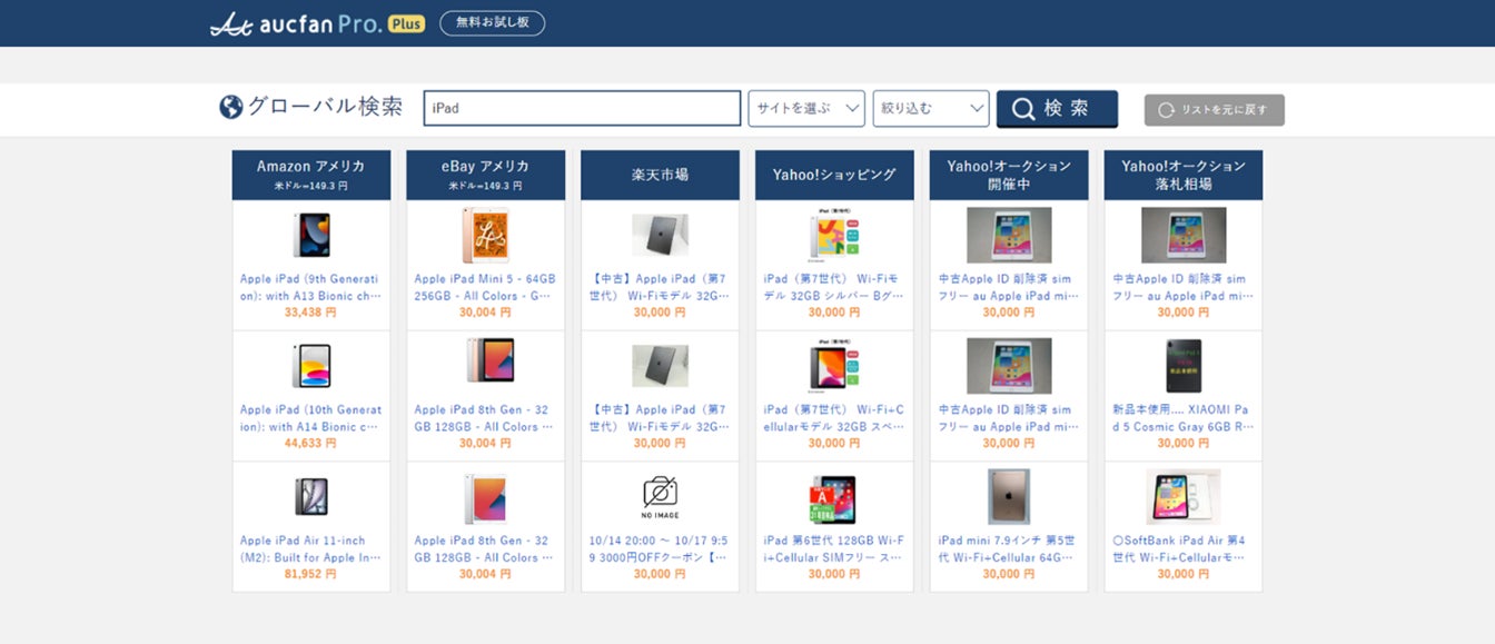 そして本日より、月額無料の相場検索・価格比較サービス「aucfan.com」内にて、このグローバル検索を無料でお試しいただけるようになりました。
