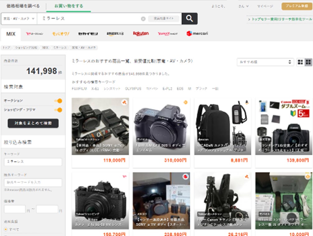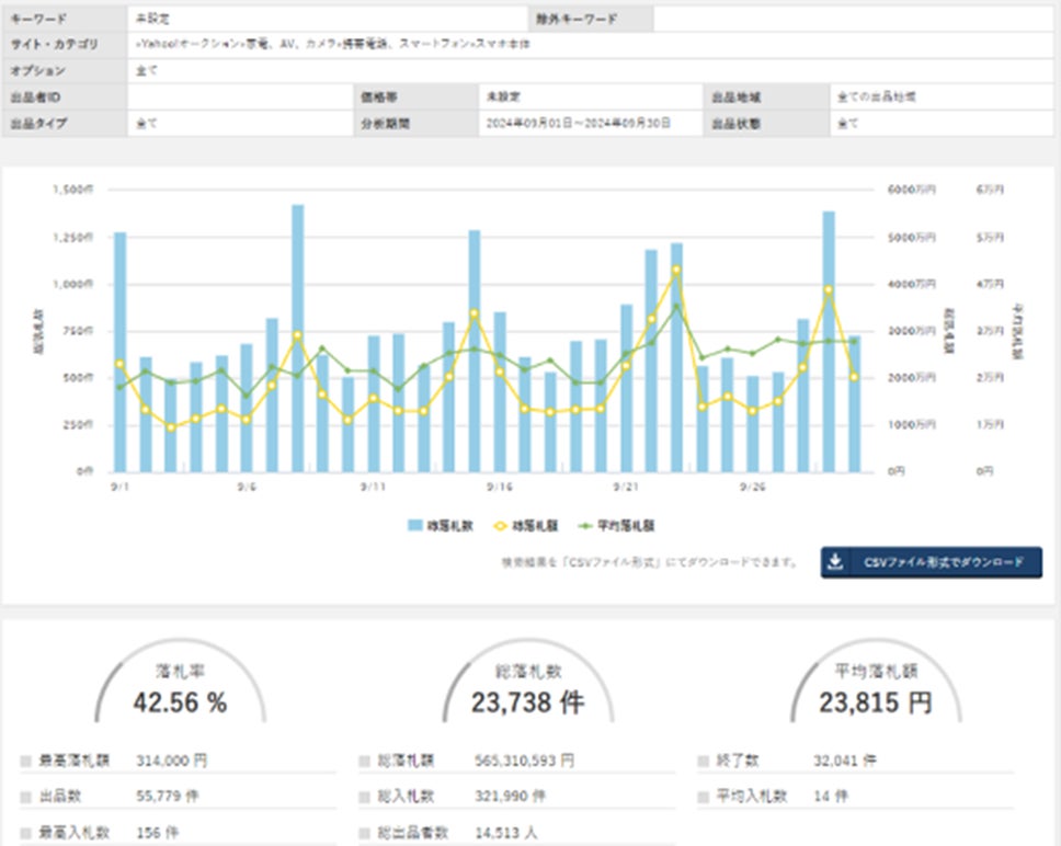 オークション、ショッピングの商品及び価格情報の比較・検索・分析ができるほか、過去に実際に取引された商品の価格や取引数などの情報の閲覧が可能です。