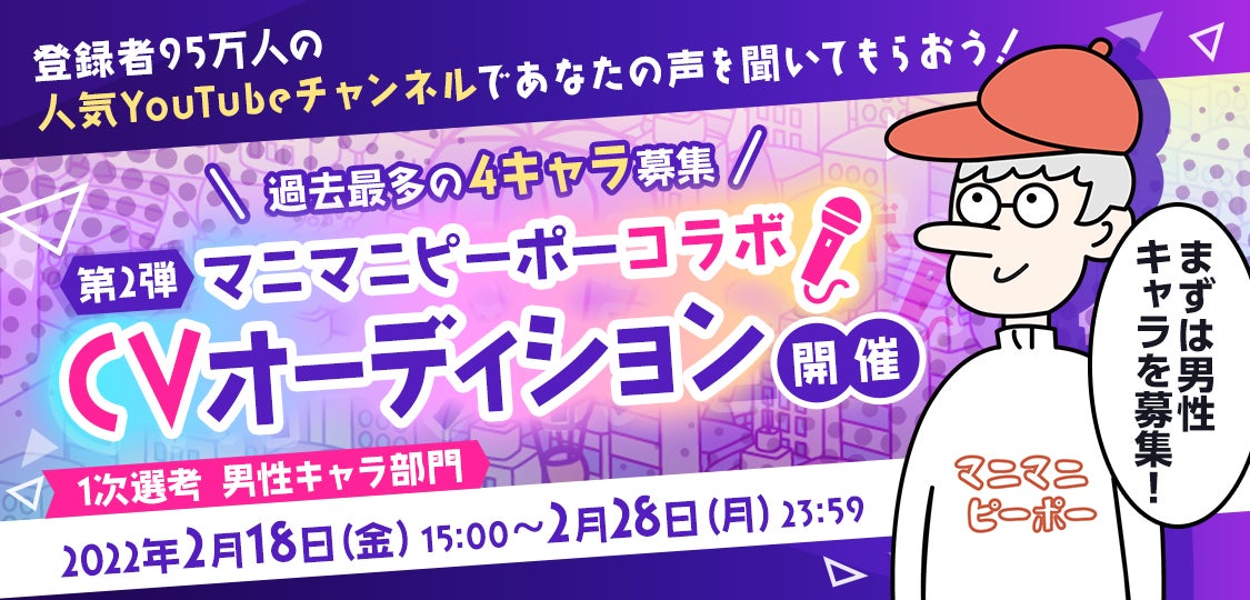 登録者95万人の人気漫画チャンネルで声優デビュー!YouTubeチャンネル『マニマニピーポー』に出演できるCVオーディションを開催!