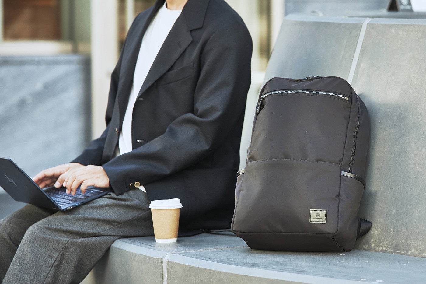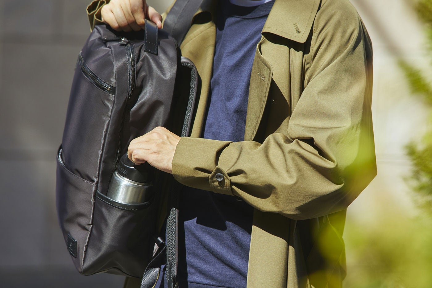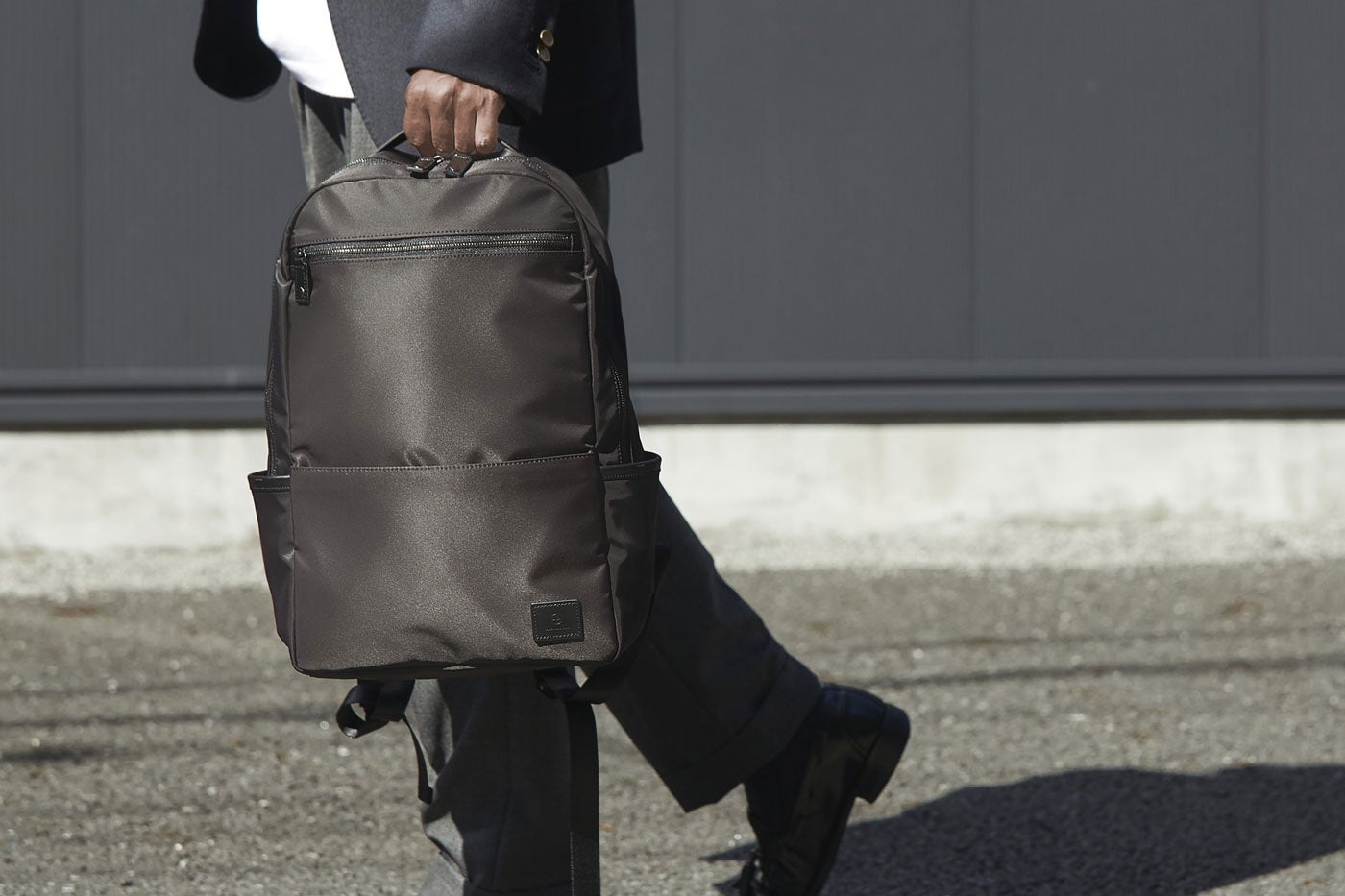 本来アクティブな印象のデイパックも、カジュアル化が進むビジネスシーンで好まれるアイテムの一つではないでしょうか。こちらはシルキータッチなナイロン素材を用いているため見た目にも品がよく、デイパックの機動性はそのままに、ドレッシーな装いにも自然に馴染みます。スーツやジャケパンスタイルにあわせるバックパックをお求めの方におすすめです。