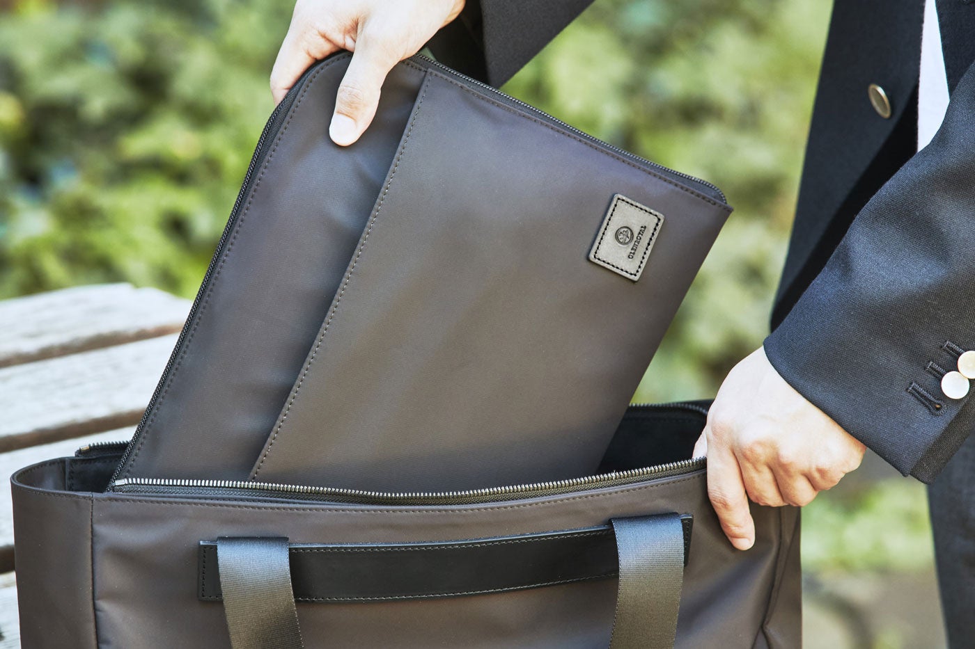 軽量で、なおかつ滑りが良いナイロン仕立てのクラッチは、バッグインバッグとしても活躍してくれます。オープンスペースや会議室への移動、カフェで作業しなければいけない際など現代の働き方にも寄り添ってくれるアイテムです。
