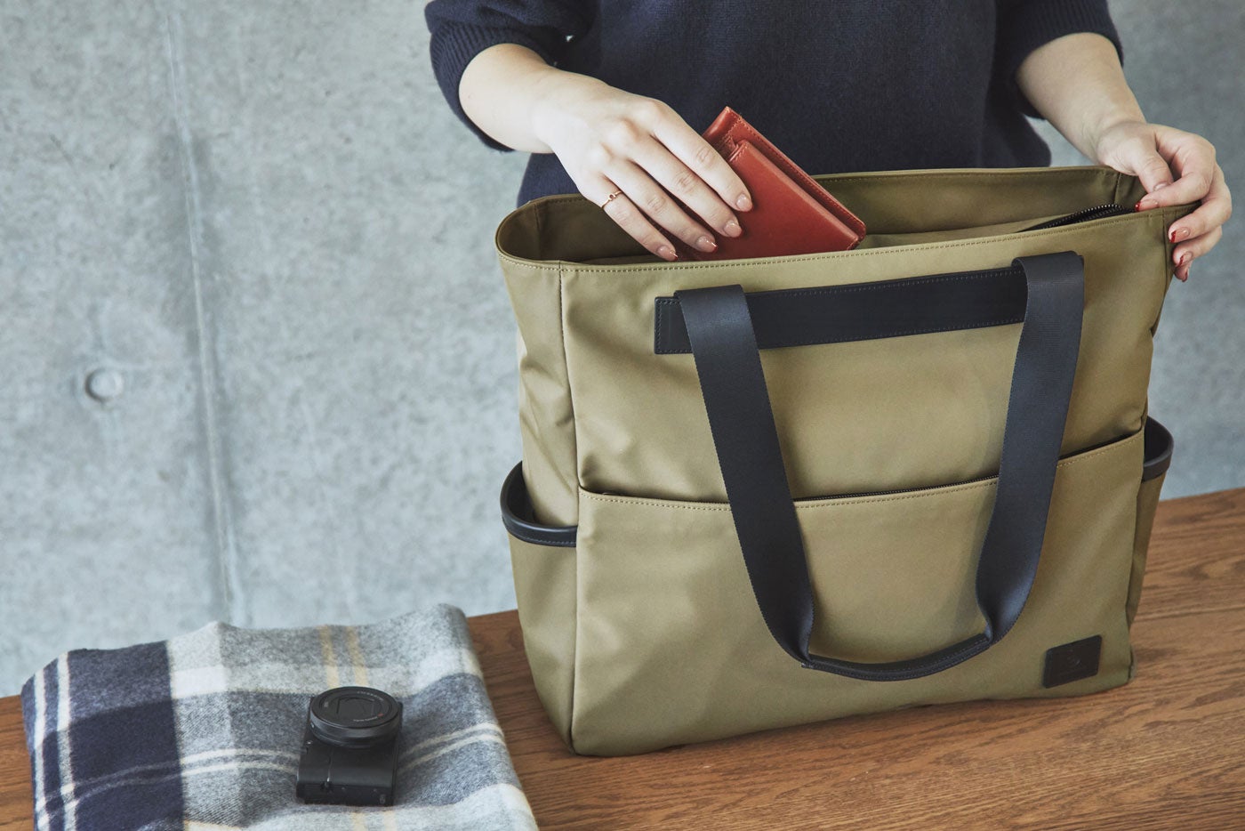 A4ファイルや13インチのノートパソコンなら余裕をもって収まる、大容量のトートバッグです。ブライドルレザーをハンドルの付け根やジッパーの引き手など、要所に使用しており、ブライドルレザーのプロダクトを持つときの高揚感や経年変化の愉しみをしっかりと味わうことができます。また、ナイロンというアウトドアな生地ながら、上品なデザインでビジネスシーンでのご活用にもおすすめです。