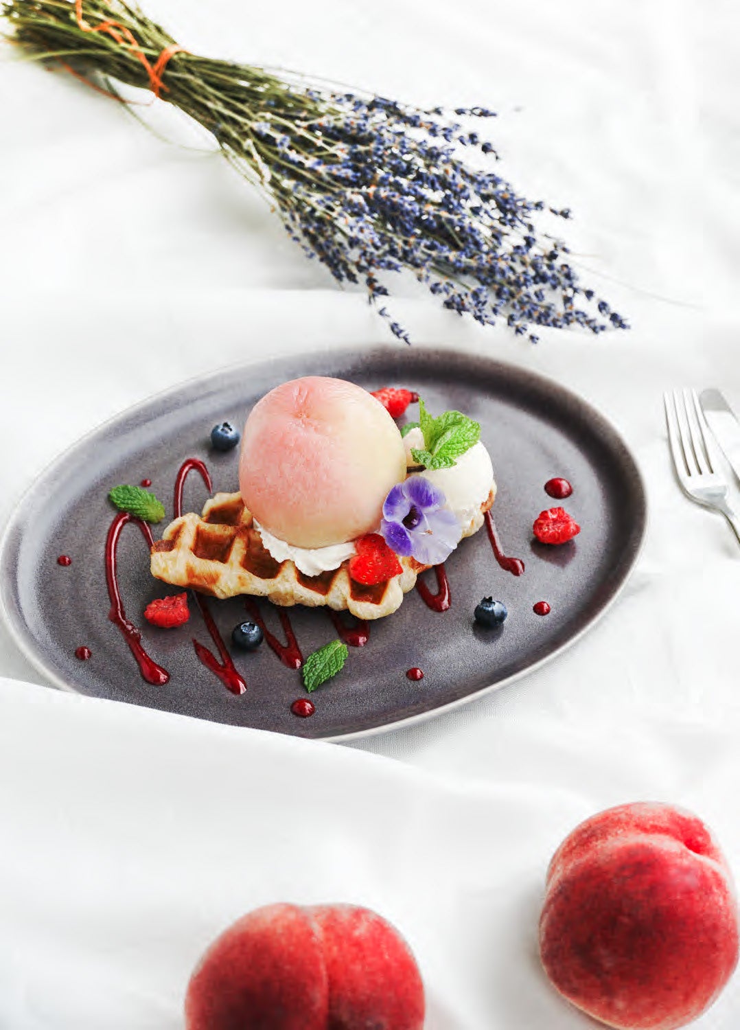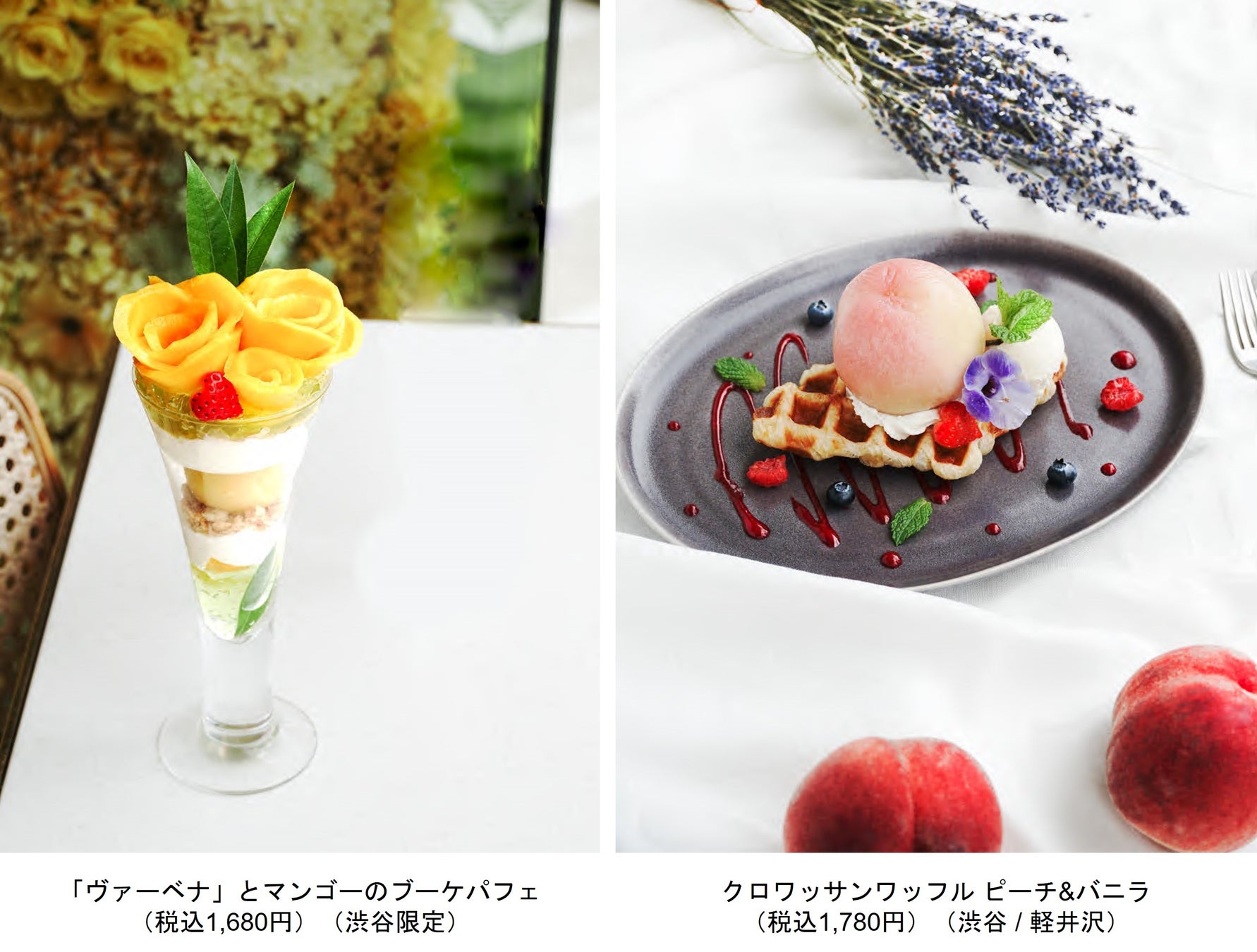 夏の限定メニューの中でも一押しは、マンゴーを花束のようにあしらったヴァーベナとマンゴーのブーケパフェ。プロヴァンスの夏のハーブ「ヴァーベナ」は、レモンを思わせる柑橘系の香り。そんなすっきりとした香りのヴァーベナのゼリーに、マンゴーの果肉とマンゴーシャーベットが加わったパフェは、甘すぎずひんやり爽やかに楽しめます。また、旬の白桃を味わえる「クロワッサンワッフル ピーチ&バニラ」は、発酵バターをたっぷりと使用したプレミアムクロワッサンのワッフルに、カスタードクリームを詰めたジューシーな白桃を、贅沢に丸ごと1個使用。旬の白桃とホイップクリーム・バニラアイスクリーム・甘酸っぱいラズベリーソースのハーモニーをお楽しみいただけます。