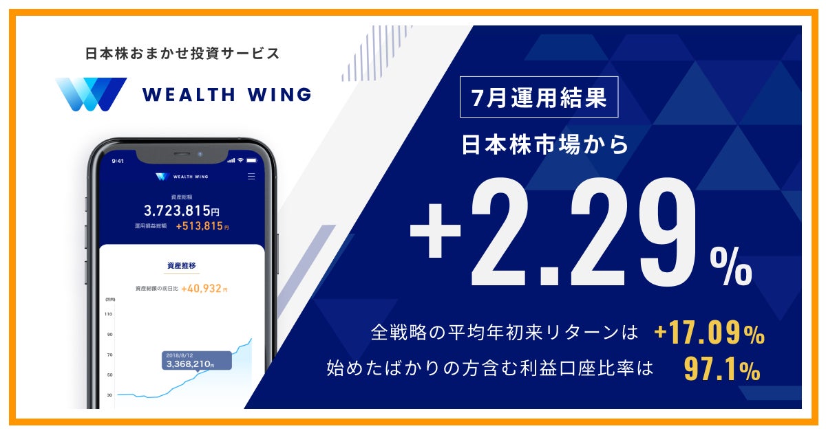 Finatextグループの日本株おまかせ投資サービス「Wealth Wing(ウェルスウイング)」、2024年7月の運用結果は日本株市場を2.29%上回る