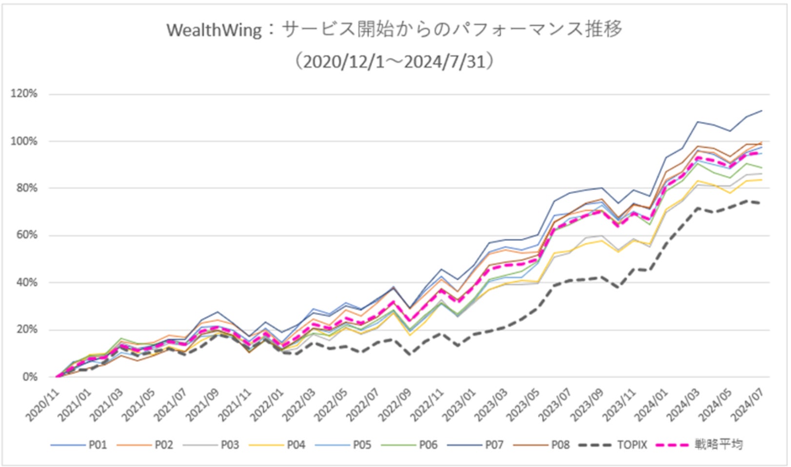 次世代金融インフラの提供を通して組込型金融を実現し、金融がもっと暮らしに寄り添う世の中を創るFinatextグループの証券会社、株式会社スマートプラス(本社:東京都千代田区、代表取締役:小林 紀子、以下「当社」)が提供する、日本株おまかせ投資サービス「Wealth Wing(ウェルスウイング)」にて、2024年7月の運用結果が最も良かった戦略は日本株市場(東証株価指数、以下「TOPIX(配当込み)」)を2.29%上回りました。