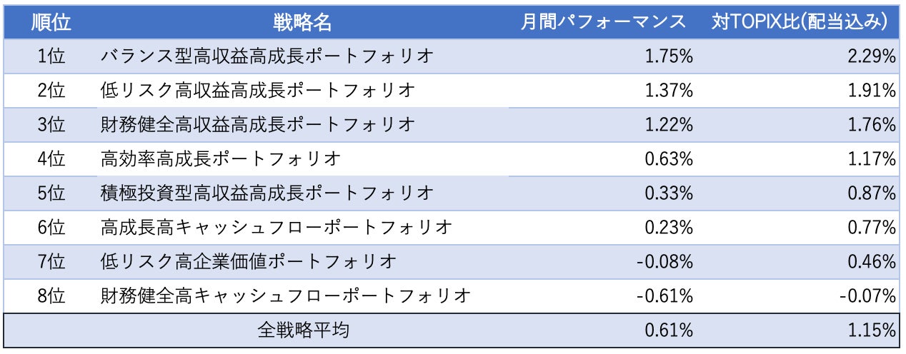 Wealth Wingがご提供する全8戦略の平均運用成績は、月間で+0.61%、対TOPIX比で+1.15%となりました。