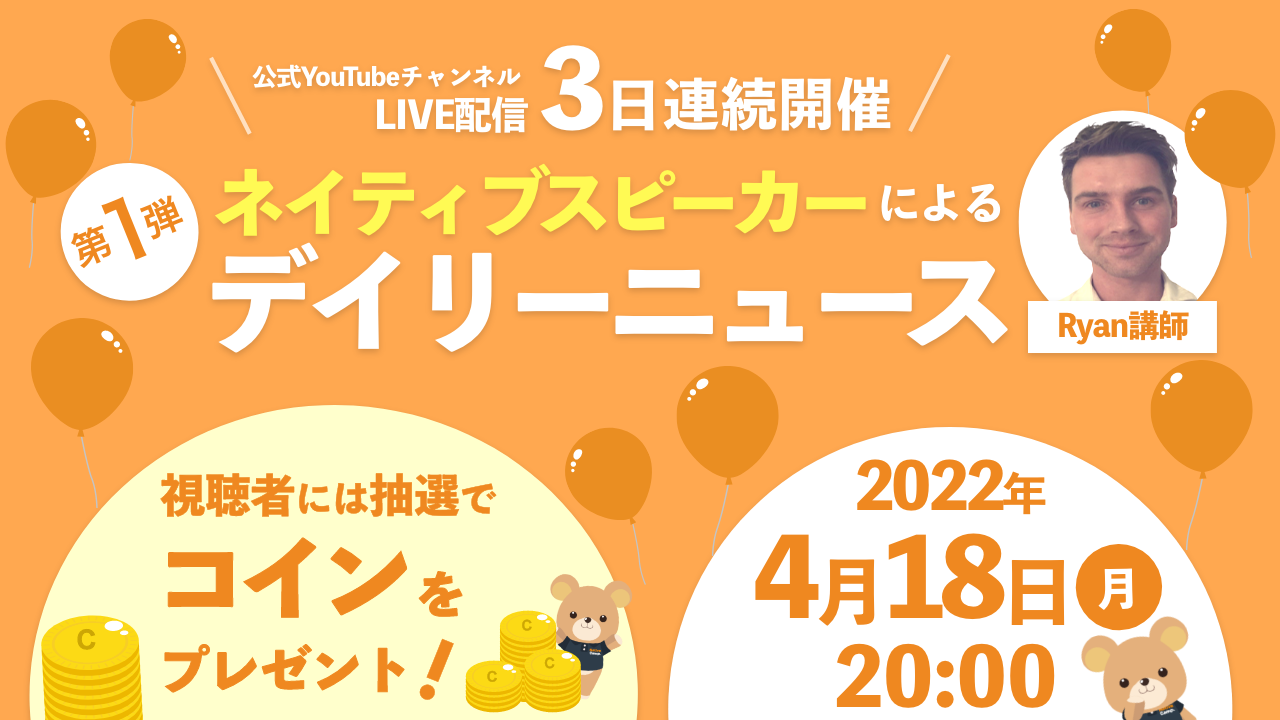 ネイティブスピーカーのレッスンでは、基礎レベルからネイティブならではの高度な英会話スキルまで幅広く学ぶことができ、高い学習効果を得られます。ネイティブキャンプはネイティブスピーカーのレッスン受講によるメリットを多くの方に広めたく、この度ネイティブスピーカーによるYouTube LIVEレッスンを開催いたします。LIVEレッスンではネイティブキャンプの人気教材「デイリーニュース」を使用した「ネイティブスピーカーによるデイリーニュース!」と題し、3日間にわたって実施いたします。