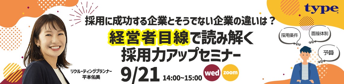 ひとつ上を目指す人のキャリア転職サイト『type』、正社員で長く働きたい女性のための転職サイト『女の転職type』は、中途採用担当者様向けのオンラインセミナーを定期開催しております(https://info.type.jp/webinar_guide)。