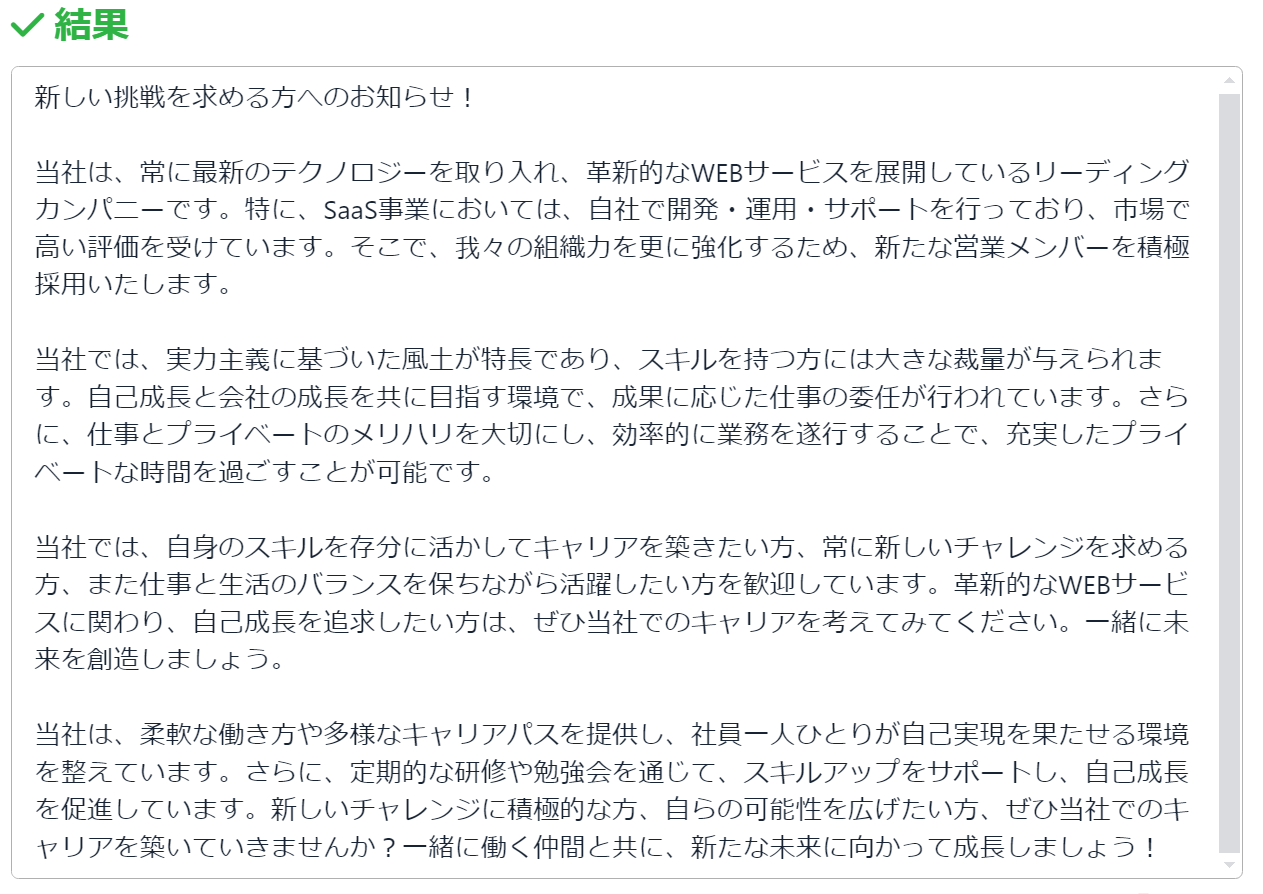 求人原稿をAIに自動で提案させることで、大幅に時間を節約し、人件費削減にもつながります。また、削減できた時間を別の業務に充てることでさらに生産性が向上します。