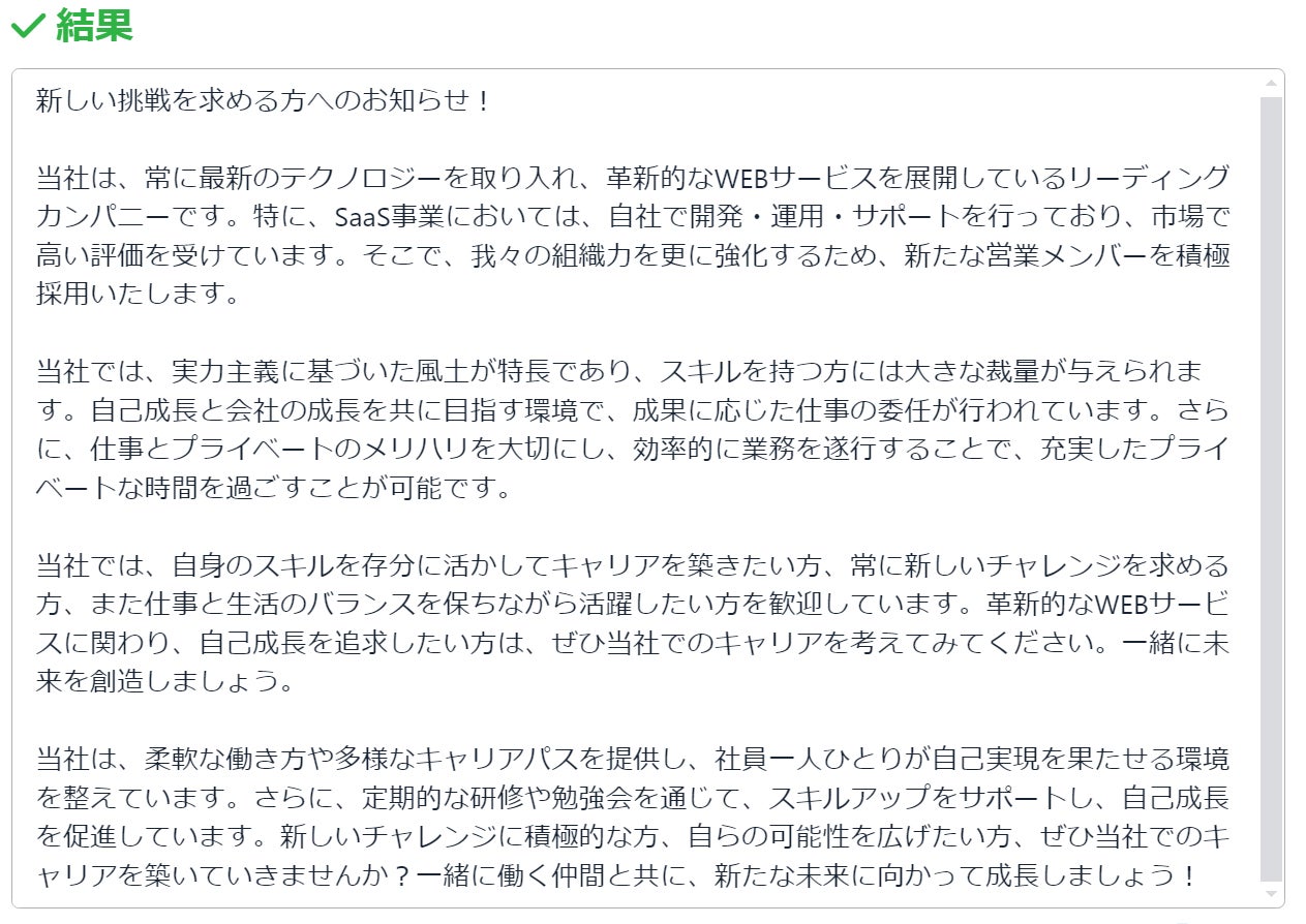 例えば「職場のPR」や「求める人物像」、「仕事内容」などと入力すると、