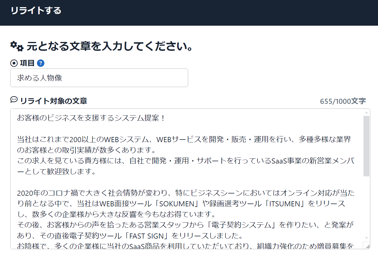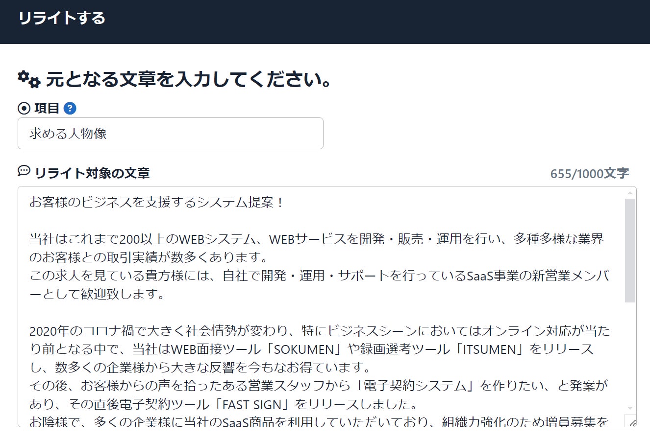 ※「項目」は、リライト対象の文章がどのような文章なのか?を入力します。