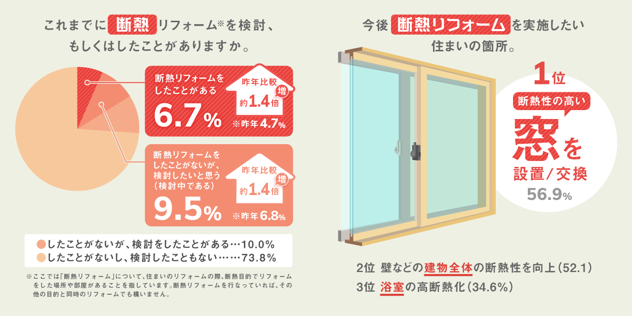「これまでに断熱リフォームを検討、もしくはしたことがありますか」という説問では、6.7%の人が「断熱リフォームをしたことがある」と回答。昨年度の調査結果4.7%から、2ptの上昇がみられました。「断熱リフォームをしたことがないが、検討したいと思う」と回答した人も昨年度から2.7%上昇しており、断熱性能を見直している方が増えていることわかりました。また、今後断熱リフォームを実施したい住まいの箇所を聞くと、56.9%が「断熱性の高い窓を設置/交換」を検討していることがわかりました。