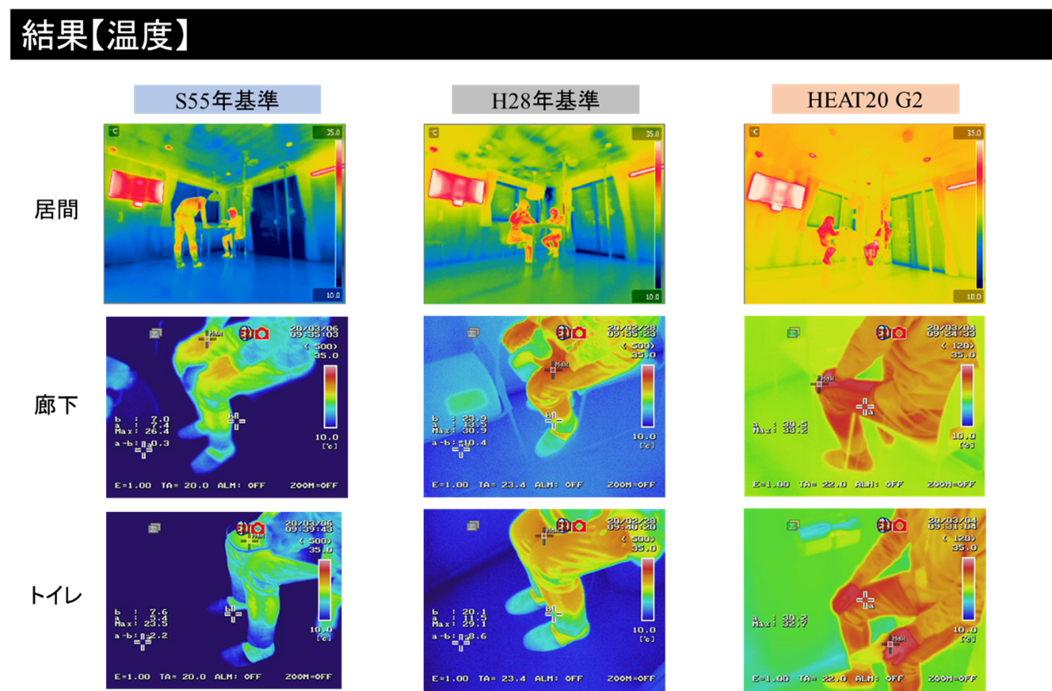 住宅の断熱性能の違いを体感出来る、「住まいStudio」には同じ冬の時期の温度条件下(0℃)で異なる断熱性能の基準で作られた3つの部屋があります。3つの部屋を比較すると、リビング(居間)とトイレの温度差は昔の家になるほど大きくなることがわかります。