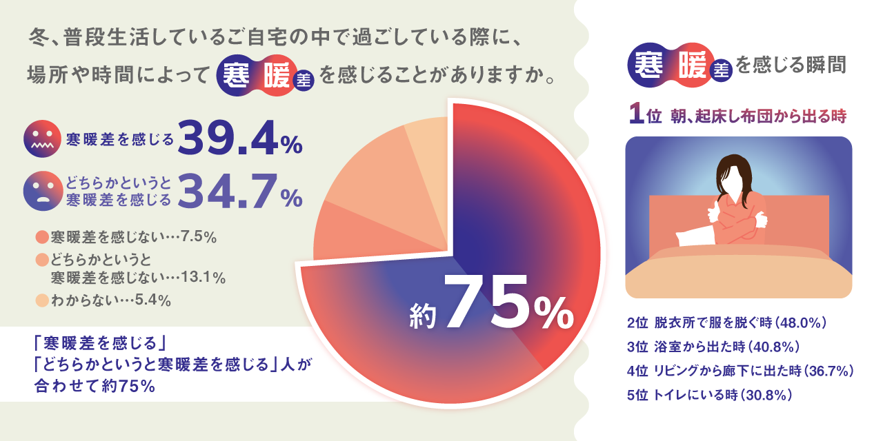約75%の人が「住まいの中での寒暖差」を感じながら生活 住まいの中での寒暖差による「寒暖差疲労」や「ヒートショック」に注意