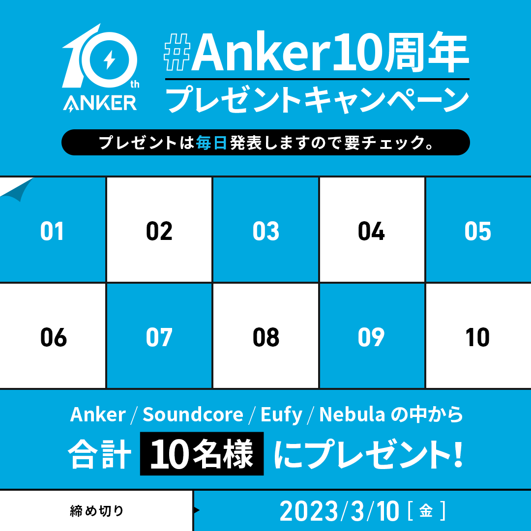 2023年3月1日(水)より10日間、アンカー・ジャパン公式Twitterでプレゼントキャンペーンを実施致します。「#Anker10周年」をつけてキャンペーン投稿を引用RTし、お気に入りのAnkerグループ製品を投稿してくださった方の中から抽選で10名に様々な製品カテゴリのAnkerグループの人気製品プレゼント致します。